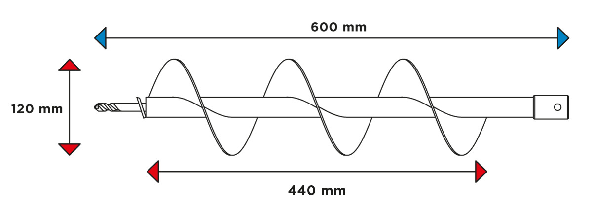 Świder glebowy, średnica 120 mm, długość całkowita 600 mm, długość robocza 440 mm, uchwyt M14, grubość łopatek 4 mm, 65 Mn, do mieszarki 58G084, stalowa konstrukcja, podwójna płytka, pojedyncza spirala.