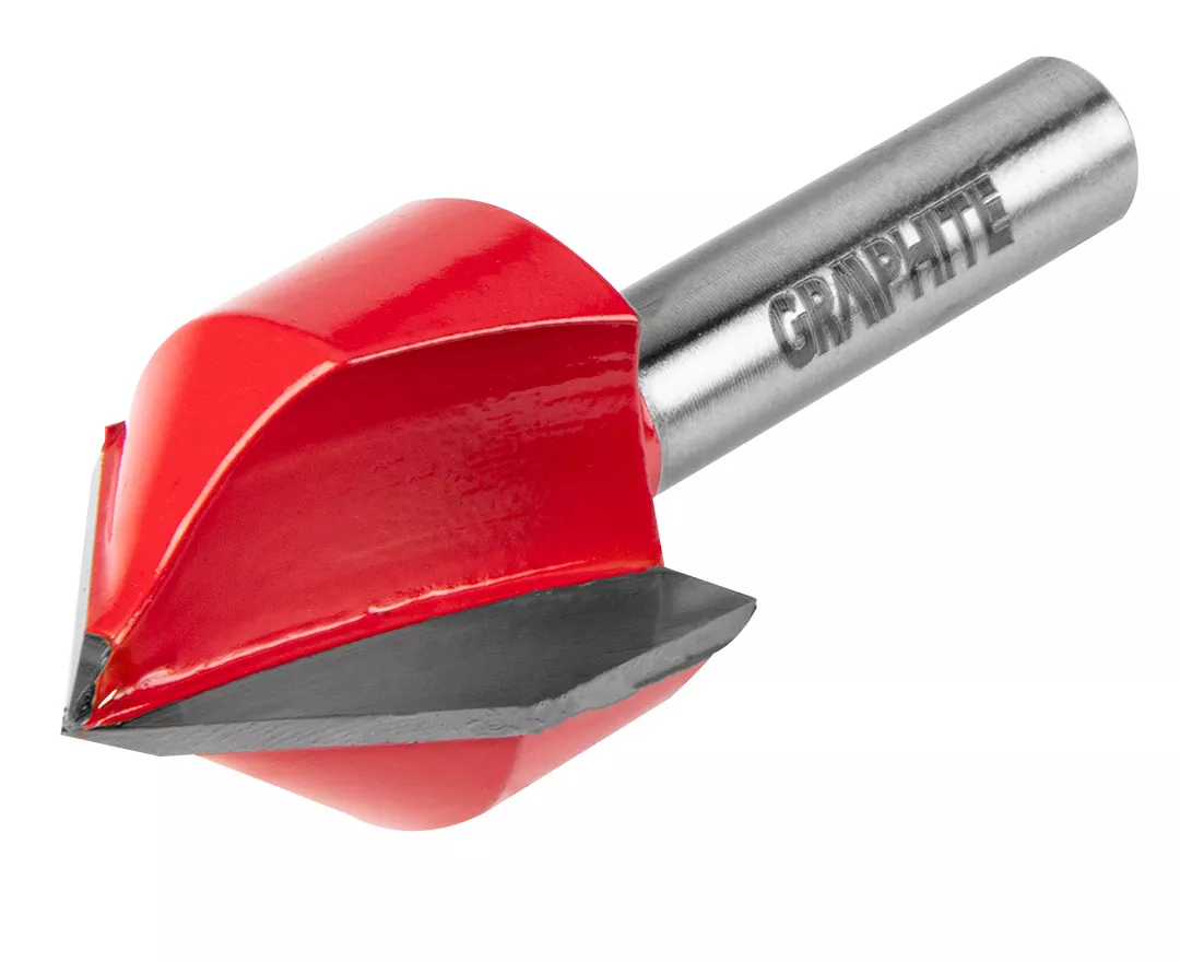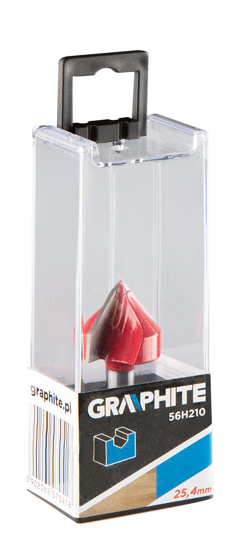 Frez do rowków typu V, HM, 25.4 x 25.4 mm, trzpień 8 mm GRAPHITE (nr ref. 56H210) przeznaczony do precyzyjnej obróbki m.in. drewna, PCV, płyt wiórowych przy pomocy frezarek górnowrzecionowych. Głowica wyposażona została w płytki skrawające wykonane z węglika spiekanego. Wymiary części roboczej: średnica 25.4 mm, wysokość 25.4 mm; średnica trzpienia 8 mm.