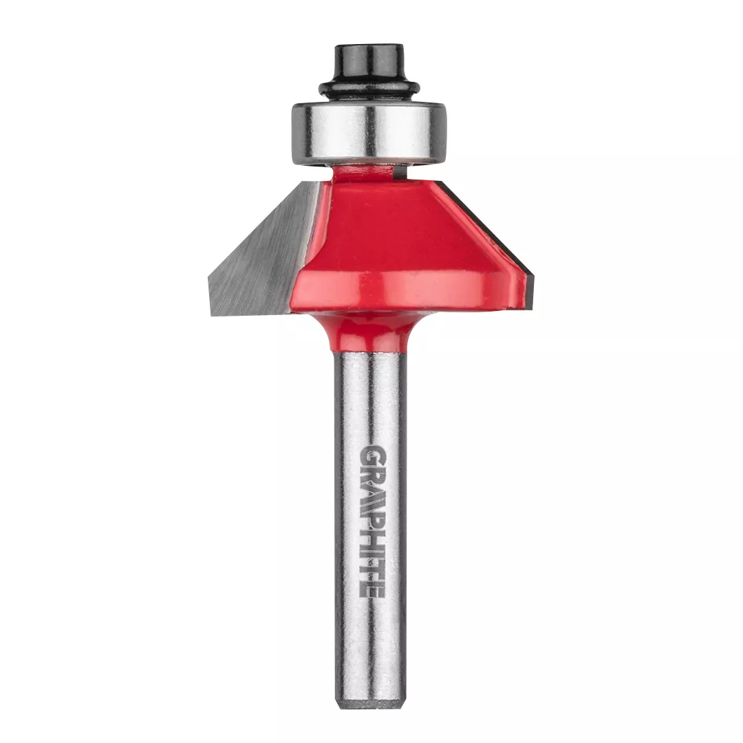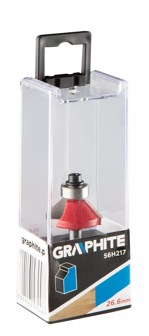 Frez kształtowy z łożyskiem, HM, 26.6 x 9.52 mm, trzpień 6 mm GRAPHITE (nr ref. 56H217) przeznaczony do precyzyjnej obróbki m.in. drewna, PCV, płyt wiórowych przy pomocy frezarek górnowrzecionowych. Głowica wyposażona została w płytki skrawające wykonane z węglika spiekanego. Frez wyposażony został w łożysko, które ułatwia prowadzenie frezarki. Wymiary części roboczej: średnica 26.9 mm, wysokość 9.52 mm; średnica trzpienia 6 mm.