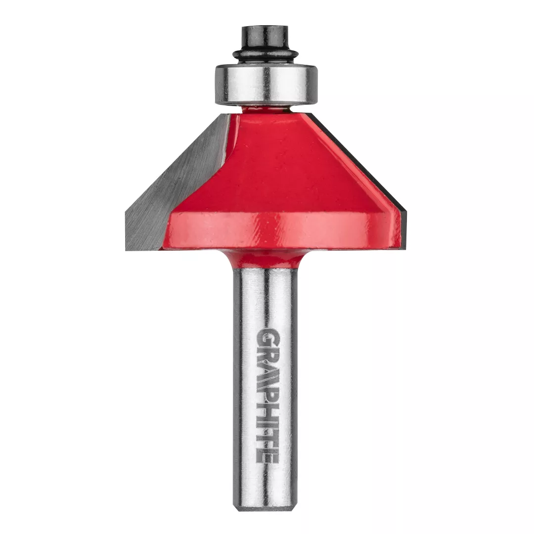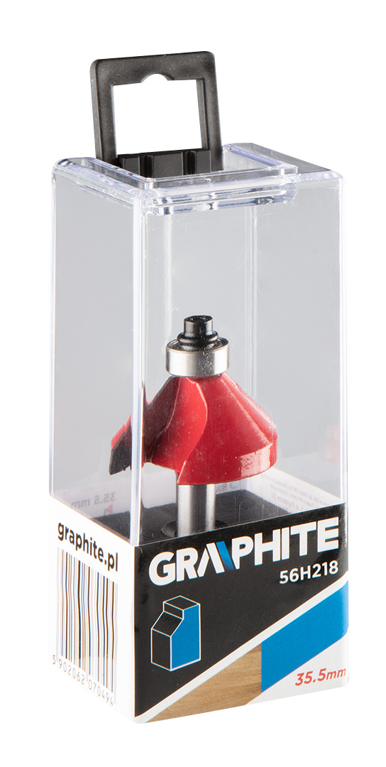 Frez kształtowy z łożyskiem, HM, 35.5 x 15.9 mm, trzpień 8 mm GRAPHITE (nr ref. 56H218) przeznaczony do precyzyjnej obróbki m.in. drewna, PCV, płyt wiórowych przy pomocy frezarek górnowrzecionowych. Głowica wyposażona została w płytki skrawające wykonane z węglika spiekanego. Frez wyposażony został w łożysko, które ułatwia prowadzenie frezarki. Wymiary części roboczej: średnica 35.5 mm, wysokość 15.9 mm; średnica trzpienia 8 mm.