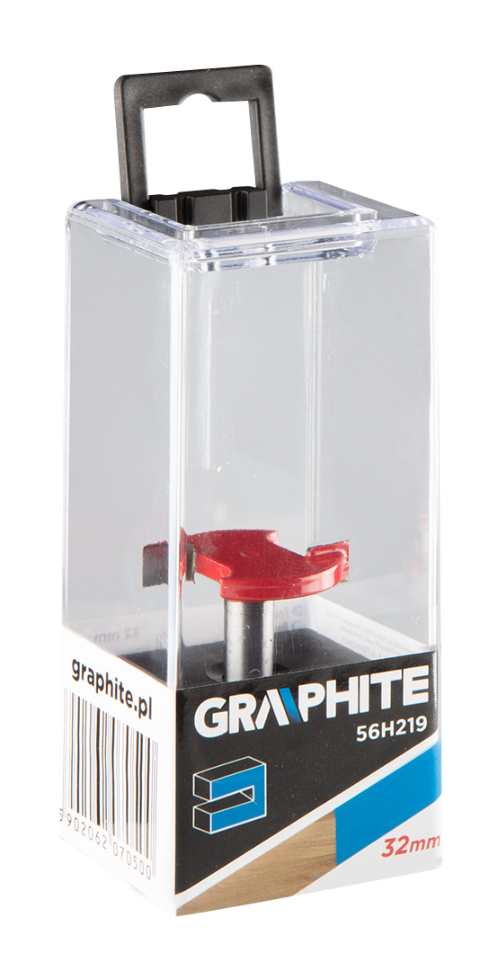 Frez do wpustów, HM, 32 x 6.35 mm, trzpień 8 mm GRAPHITE (nr ref. 56H219) przeznaczony do precyzyjnej obróbki m.in. drewna, PCV, płyt wiórowych przy pomocy frezarek górnowrzecionowych. Głowica wyposażona została w płytki skrawające wykonane z węglika spiekanego. Wymiary części roboczej: średnica 32 mm, wysokość 6.35 mm; średnica trzpienia 8 mm.