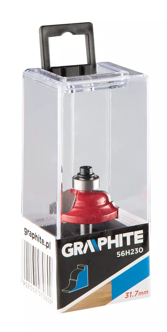 Frez kształtowy z łożyskiem, ozdobny, HM, 31.7 x 12.7 mm, trzpień 6 mm GRAPHITE (nr ref. 56H230) przeznaczony do precyzyjnej obróbki m.in. drewna, PCV, płyt wiórowych przy pomocy frezarek górnowrzecionowych. Głowica wyposażona została w płytki skrawające wykonane z węglika spiekanego. Frez wyposażony został w łożysko, które ułatwia prowadzenie frezarki. Wymiary części roboczej: średnica 31.7 mm, wysokość 12.7 mm; średnica trzpienia 6 mm.
