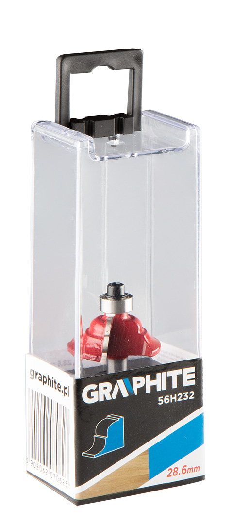 Frez kształtowy z łożyskiem, ozdobny, HM, 28.6 x 11.7 mm, trzpień 6 mm GRAPHITE (nr ref. 56H232) przeznaczony do precyzyjnej obróbki m.in. drewna, PCV, płyt wiórowych przy pomocy frezarek górnowrzecionowych. Głowica wyposażona została w płytki skrawające wykonane z węglika spiekanego. Frez wyposażony został w łożysko, które ułatwia prowadzenie frezarki. Wymiary części roboczej: średnica 28.6 mm, wysokość 11.7 mm; średnica trzpienia 6 mm.