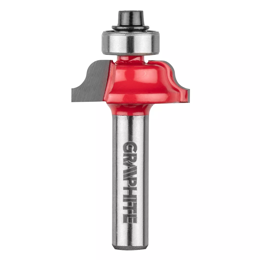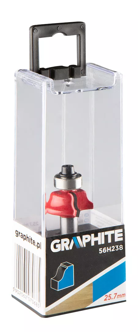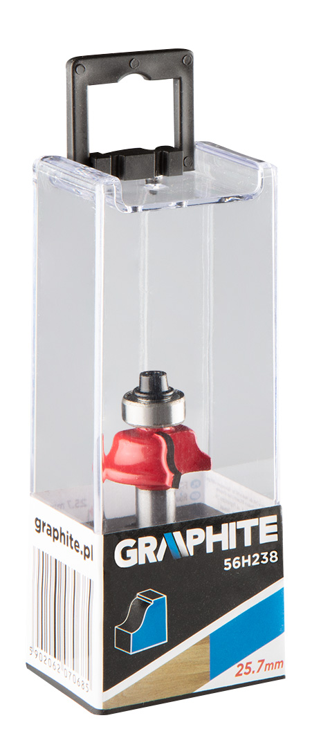 Frez kształtowy z łożyskiem, ozdobny, HM, 25.7 x 9.7 mm, trzpień 8 mm GRAPHITE (nr ref. 56H238) przeznaczony do precyzyjnej obróbki m.in. drewna, PCV, płyt wiórowych przy pomocy frezarek górnowrzecionowych. Głowica wyposażona została w płytki skrawające wykonane z węglika spiekanego. Frez wyposażony został w łożysko, które ułatwia prowadzenie frezarki. Wymiary części roboczej: średnica 25.7 mm, wysokość 9.7 mm; średnica trzpienia 8 mm.