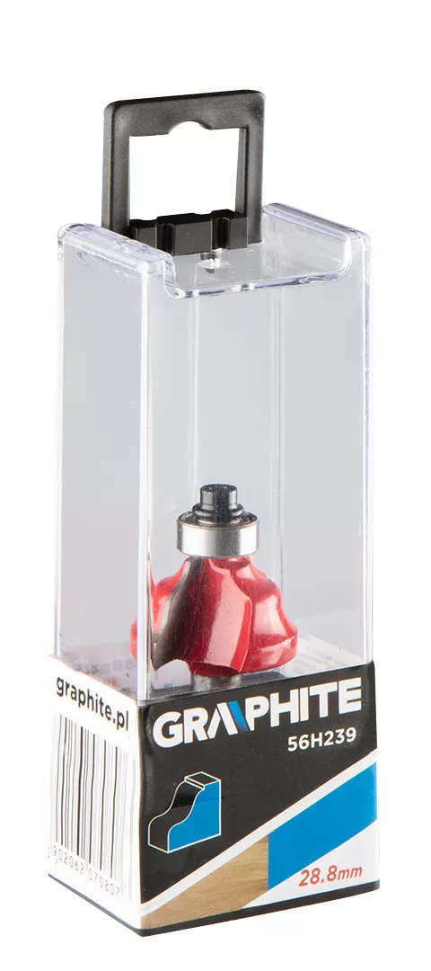 Frez kształtowy z łożyskiem, ozdobny, HM, 28.8 x 15.9 mm, trzpień 8 mm GRAPHITE (nr ref. 56H239) przeznaczony do precyzyjnej obróbki m.in. drewna, PCV, płyt wiórowych przy pomocy frezarek górnowrzecionowych. Głowica wyposażona została w płytki skrawające wykonane z węglika spiekanego. Frez wyposażony został w łożysko, które ułatwia prowadzenie frezarki. Wymiary części roboczej: średnica 28.8 mm, wysokość 15.9 mm; średnica trzpienia 8 mm.