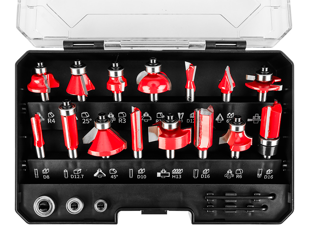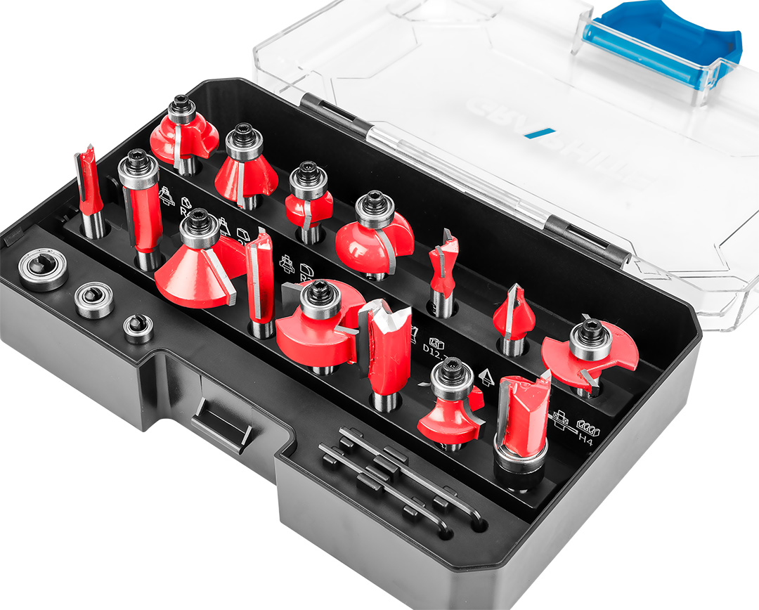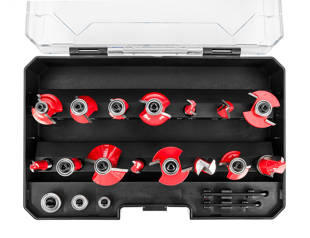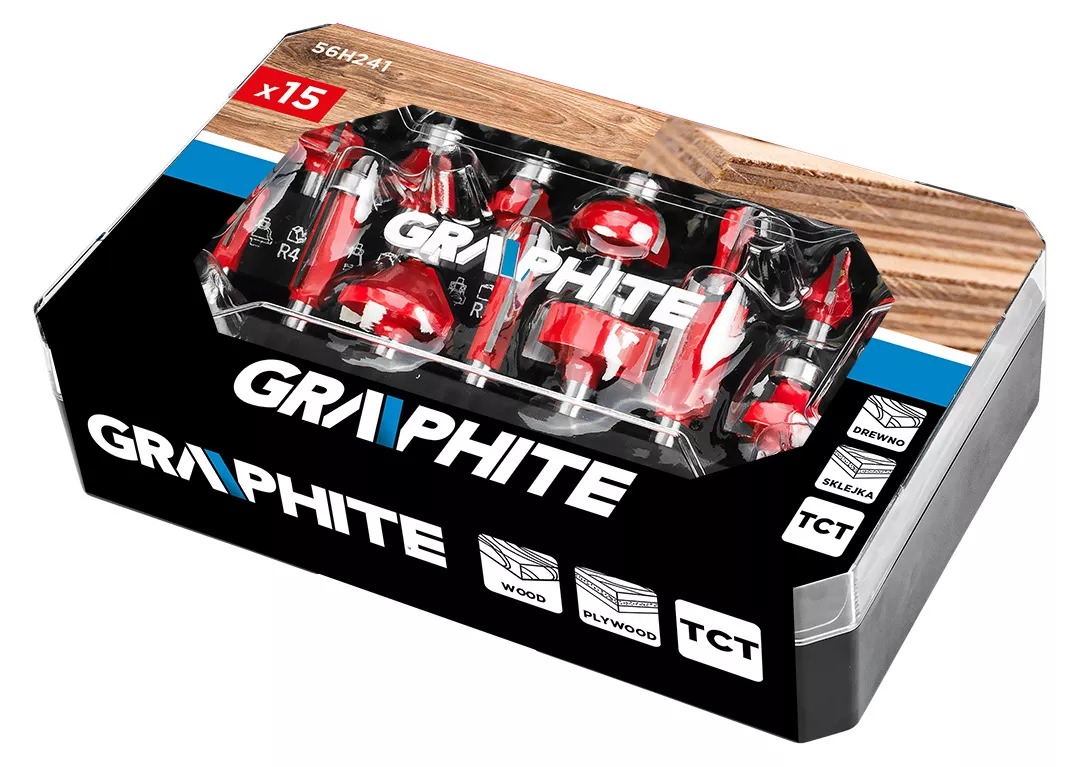 Frezy widiowe, trzpień 8 mm, zestaw 15 sztuk 56H241 marki GRAPHITE to zestaw różnorodnych frezów widiowych ze średnicą trzpienia 8 mm, przeznaczony do pracy z drewnem, sklejką, PCV i płytami wiórowymi. Otrza Wykonane z trwałego oraz odpornego na zużycie węglika spiekanego (ostrze) i TCT, będzie nieocenionym narzędziem przez długi czas użytkowania.