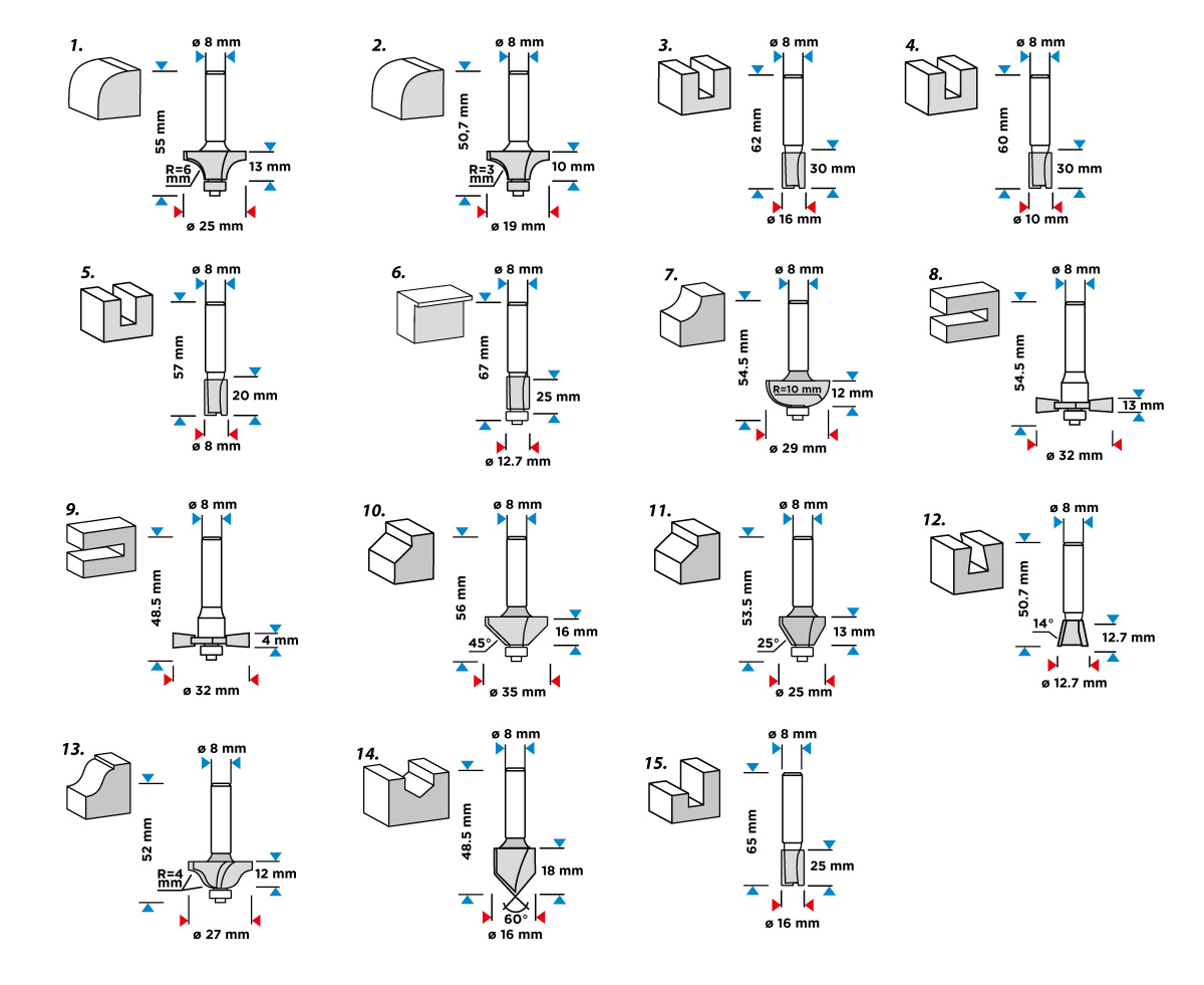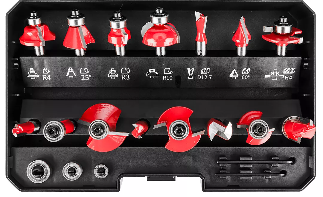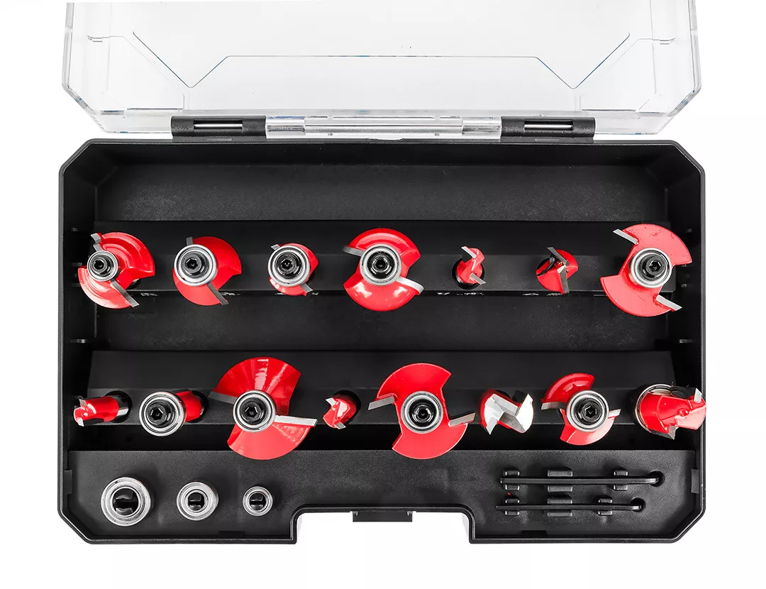 Frezy widiowe, trzpień 8 mm, zestaw 15 sztuk 56H241 marki GRAPHITE to zestaw różnorodnych frezów widiowych ze średnicą trzpienia 8 mm, przeznaczony do pracy z drewnem, sklejką, PCV i płytami wiórowymi. Otrza Wykonane z trwałego oraz odpornego na zużycie węglika spiekanego (ostrze) i TCT, będzie nieocenionym narzędziem przez długi czas użytkowania.