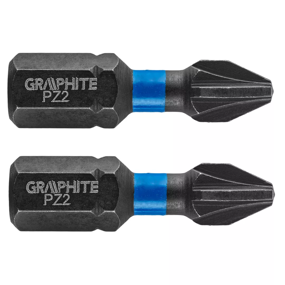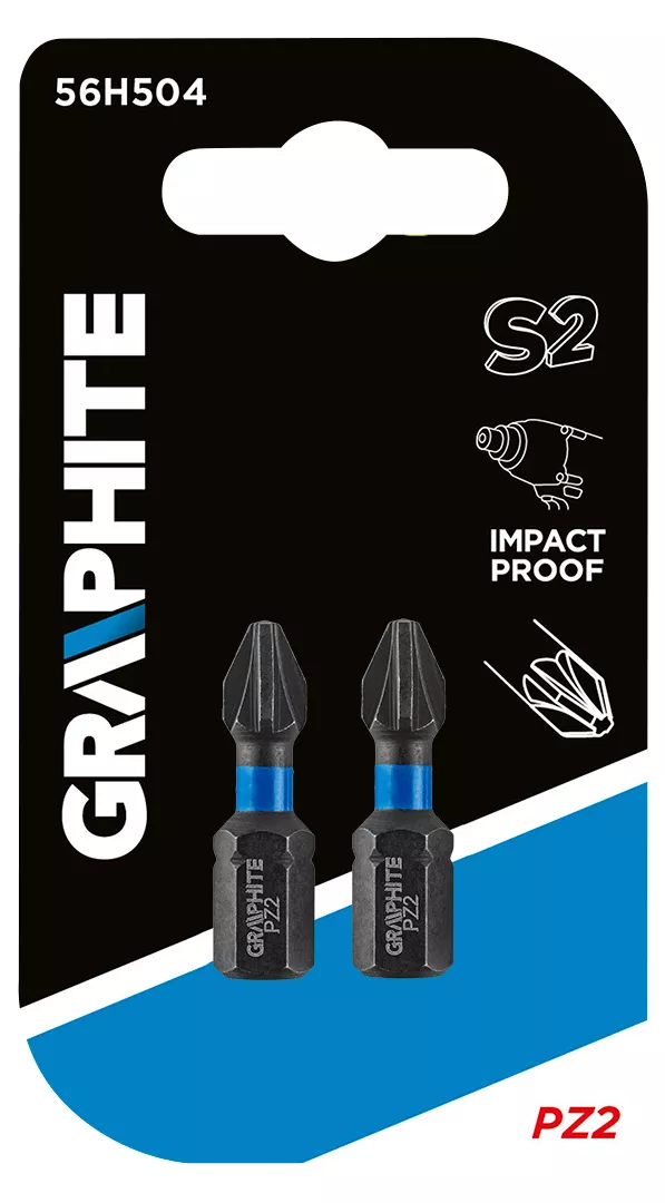 Bity udarowe GRAPHITE (nr ref. 56H504) typ PZ2, o długości całkowitej 25 mm, to wytrzymałe bity przeznaczone do cięższych prac z zastosowaniem wysokich momentów obrotowych przy użyciu wkrętarek bądź zakrętarek udarowych. Wykonane z wysokogatunkowej stali S2, która cechuje się zwiększoną elastycznością i wytrzymałością na uszkodzenia mechaniczne. Obracająca się pod wpływem wysokiego momentu obrotowego strefa skrętna zmniejsza przenoszenie siły, przez co bit jest bardziej odporny na złamanie, a jego żywotność jest wydłużona kilkukrotnie. Końcówka robocza grota gwarantuje idealne dopasowanie. Marka GRAPHITE oferuje szeroki asortyment elektronarzędzi spełniających wymagania profesjonalistów.