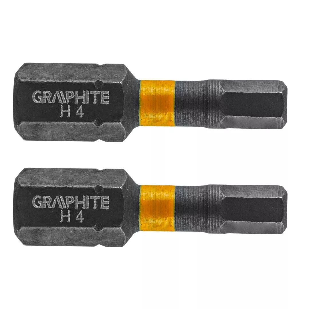 Bity udarowe GRAPHITE (nr ref. 56H507) typ HEX4, o długości całkowitej 25 mm, to wytrzymałe bity przeznaczone do cięższych prac z zastosowaniem wysokich momentów obrotowych przy użyciu wkrętarek bądź zakrętarek udarowych. Wykonane z wysokogatunkowej stali S2, która cechuje się zwiększoną elastycznością i wytrzymałością na uszkodzenia mechaniczne. Obracająca się pod wpływem wysokiego momentu obrotowego strefa skrętna zmniejsza przenoszenie siły, przez co bit jest bardziej odporny na złamanie, a jego żywotność jest wydłużona kilkukrotnie. Końcówka robocza grota gwarantuje idealne dopasowanie. Marka GRAPHITE oferuje szeroki asortyment elektronarzędzi spełniających wymagania profesjonalistów.