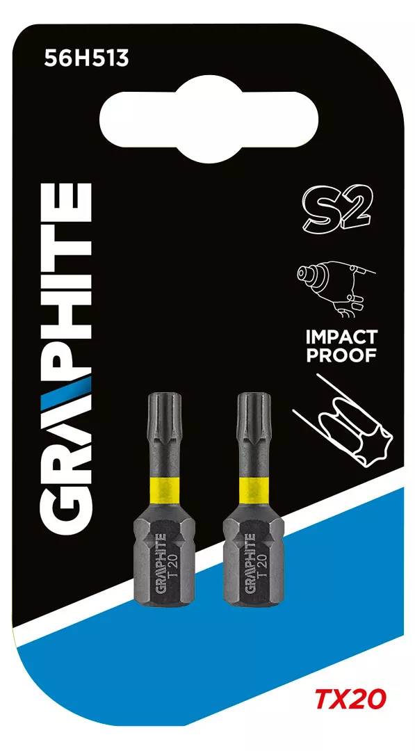 Bity udarowe GRAPHITE (nr ref. 56H513) typ TX20, o długości całkowitej 25 mm, to wytrzymałe bity przeznaczone do cięższych prac z zastosowaniem wysokich momentów obrotowych przy użyciu wkrętarek bądź zakrętarek udarowych. Wykonane z wysokogatunkowej stali S2, która cechuje się zwiększoną elastycznością i wytrzymałością na uszkodzenia mechaniczne. Obracająca się pod wpływem wysokiego momentu obrotowego strefa skrętna zmniejsza przenoszenie siły, przez co bit jest bardziej odporny na złamanie, a jego żywotność jest wydłużona kilkukrotnie. Końcówka robocza grota gwarantuje idealne dopasowanie. Marka GRAPHITE oferuje szeroki asortyment elektronarzędzi spełniających wymagania profesjonalistów.