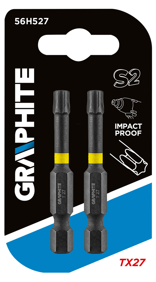 Bity udarowe GRAPHITE (nr ref. 56H527) typ TX27, o długości całkowitej 50 mm, to wytrzymałe bity przeznaczone do cięższych prac z zastosowaniem wysokich momentów obrotowych przy użyciu wkrętarek bądź zakrętarek udarowych. Wykonane z wysokogatunkowej stali S2, która cechuje się zwiększoną elastycznością i wytrzymałością na uszkodzenia mechaniczne. Obracająca się pod wpływem wysokiego momentu obrotowego strefa skrętna zmniejsza przenoszenie siły, przez co bit jest bardziej odporny na złamanie, a jego żywotność jest wydłużona kilkukrotnie. Końcówka robocza grota gwarantuje idealne dopasowanie. Marka GRAPHITE oferuje szeroki asortyment elektronarzędzi spełniających wymagania profesjonalistów.