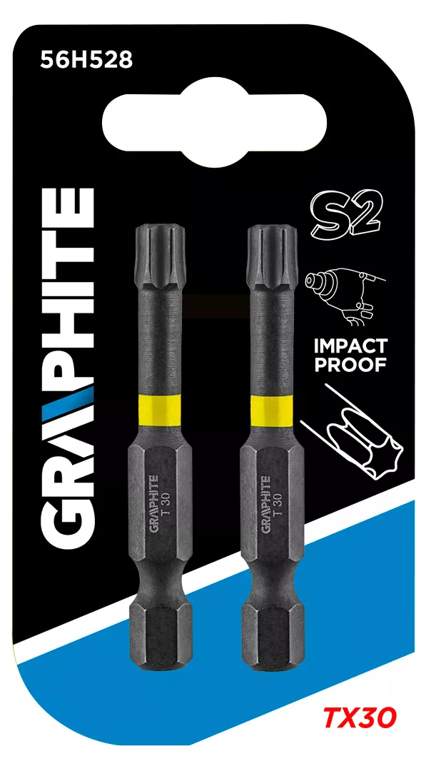 Bity udarowe GRAPHITE (nr ref. 56H528) typ TX30, o długości całkowitej 50 mm, to wytrzymałe bity przeznaczone do cięższych prac z zastosowaniem wysokich momentów obrotowych przy użyciu wkrętarek bądź zakrętarek udarowych. Wykonane z wysokogatunkowej stali S2, która cechuje się zwiększoną elastycznością i wytrzymałością na uszkodzenia mechaniczne. Obracająca się pod wpływem wysokiego momentu obrotowego strefa skrętna zmniejsza przenoszenie siły, przez co bit jest bardziej odporny na złamanie, a jego żywotność jest wydłużona kilkukrotnie. Końcówka robocza grota gwarantuje idealne dopasowanie. Marka GRAPHITE oferuje szeroki asortyment elektronarzędzi spełniających wymagania profesjonalistów.