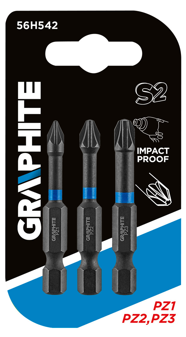 Bity udarowe GRAPHITE (nr ref. 56H542) typ PZ1/2/3, o długości całkowitej 50 mm, to wytrzymałe bity przeznaczone do cięższych prac z zastosowaniem wysokich momentów obrotowych przy użyciu wkrętarek bądź zakrętarek udarowych. Wykonane z wysokogatunkowej stali S2, która cechuje się zwiększoną elastycznością i wytrzymałością na uszkodzenia mechaniczne. Obracająca się pod wpływem wysokiego momentu obrotowego strefa skrętna zmniejsza przenoszenie siły, przez co bit jest bardziej odporny na złamanie, a jego żywotność jest wydłużona kilkukrotnie. Końcówka robocza grota gwarantuje idealne dopasowanie. Marka GRAPHITE oferuje szeroki asortyment elektronarzędzi spełniających wymagania profesjonalistów.