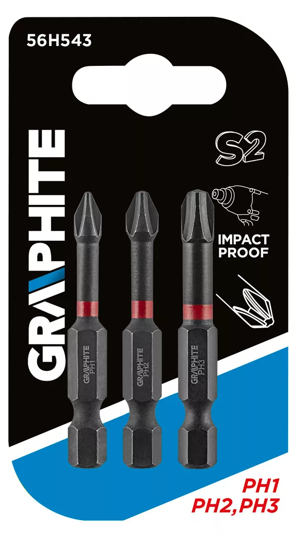 Bity udarowe GRAPHITE (nr ref. 56H543) typ PH1/2/3, o długości całkowitej 50 mm, to wytrzymałe bity przeznaczone do cięższych prac z zastosowaniem wysokich momentów obrotowych przy użyciu wkrętarek bądź zakrętarek udarowych. Wykonane z wysokogatunkowej stali S2, która cechuje się zwiększoną elastycznością i wytrzymałością na uszkodzenia mechaniczne. Obracająca się pod wpływem wysokiego momentu obrotowego strefa skrętna zmniejsza przenoszenie siły, przez co bit jest bardziej odporny na złamanie, a jego żywotność jest wydłużona kilkukrotnie. Końcówka robocza grota gwarantuje idealne dopasowanie. Marka GRAPHITE oferuje szeroki asortyment elektronarzędzi spełniających wymagania profesjonalistów.