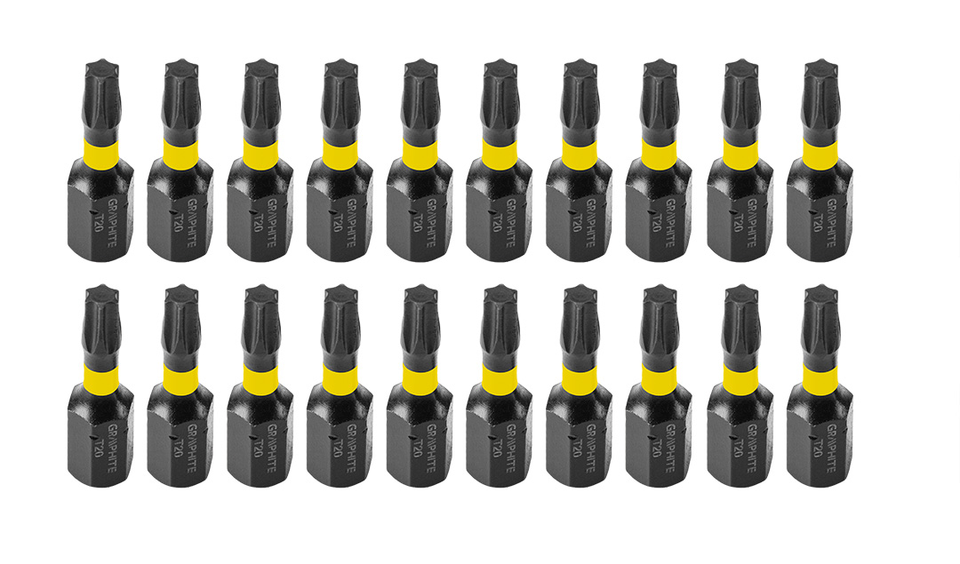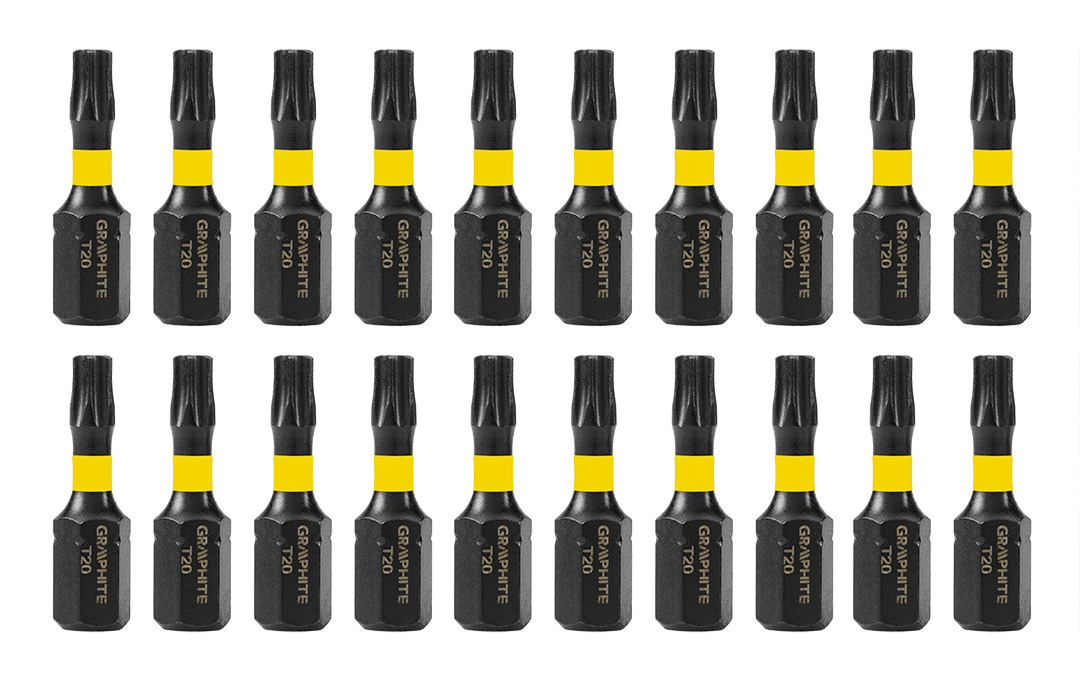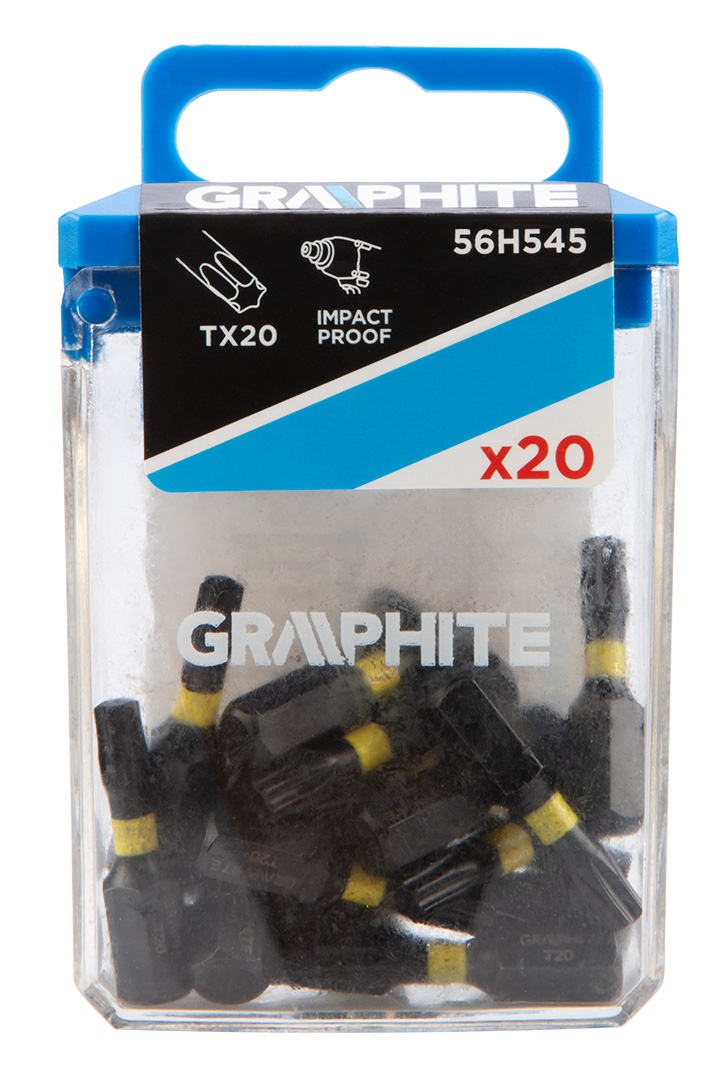 Bity udarowe TX20 x 25 mm, 20 sztuk 56H545 marki GRAPHITE typu TORX 20 o całkowitej długości 25 mm. Polecane są do napędu ¼” oraz do ciężkich prac z zastosowaniem wysokich momentów obrotowych, przy użyciu wkrętarek lub zakrętarek udarowych. Bity udarowe wykonane zostały z trwałej stali S2. W zestawie oferowanych jest 20 sztuk elementów dla profesjonalistów i majsterkowiczów.