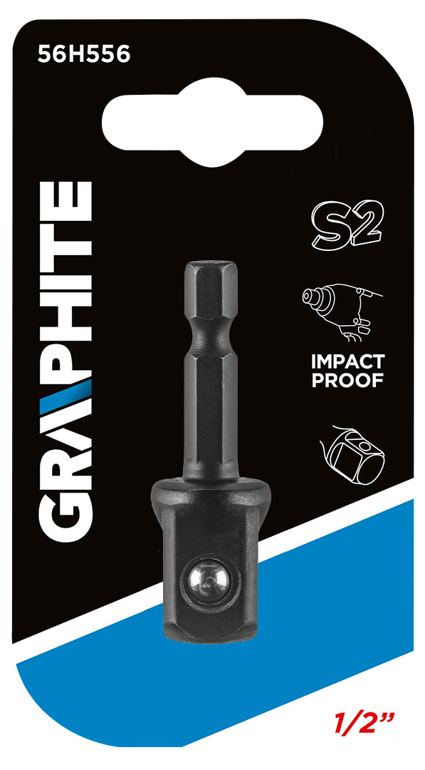 Adapter z 1/4” HEX na 1/2” KWADRAT GRAPHITE (nr ref. 56H556). Przeznaczony do cięższych prac z zastosowaniem wysokich momentów obrotowych przy użyciu wkrętarek bądź zakrętarek udarowych. Wykonana z wysokogatunkowej stali S2, która cechuje się zwiększoną elastycznością i wytrzymałością na uszkodzenia mechaniczne. Marka GRAPHITE oferuje szeroki asortyment elektronarzędzi spełniających wymagania profesjonalistów.