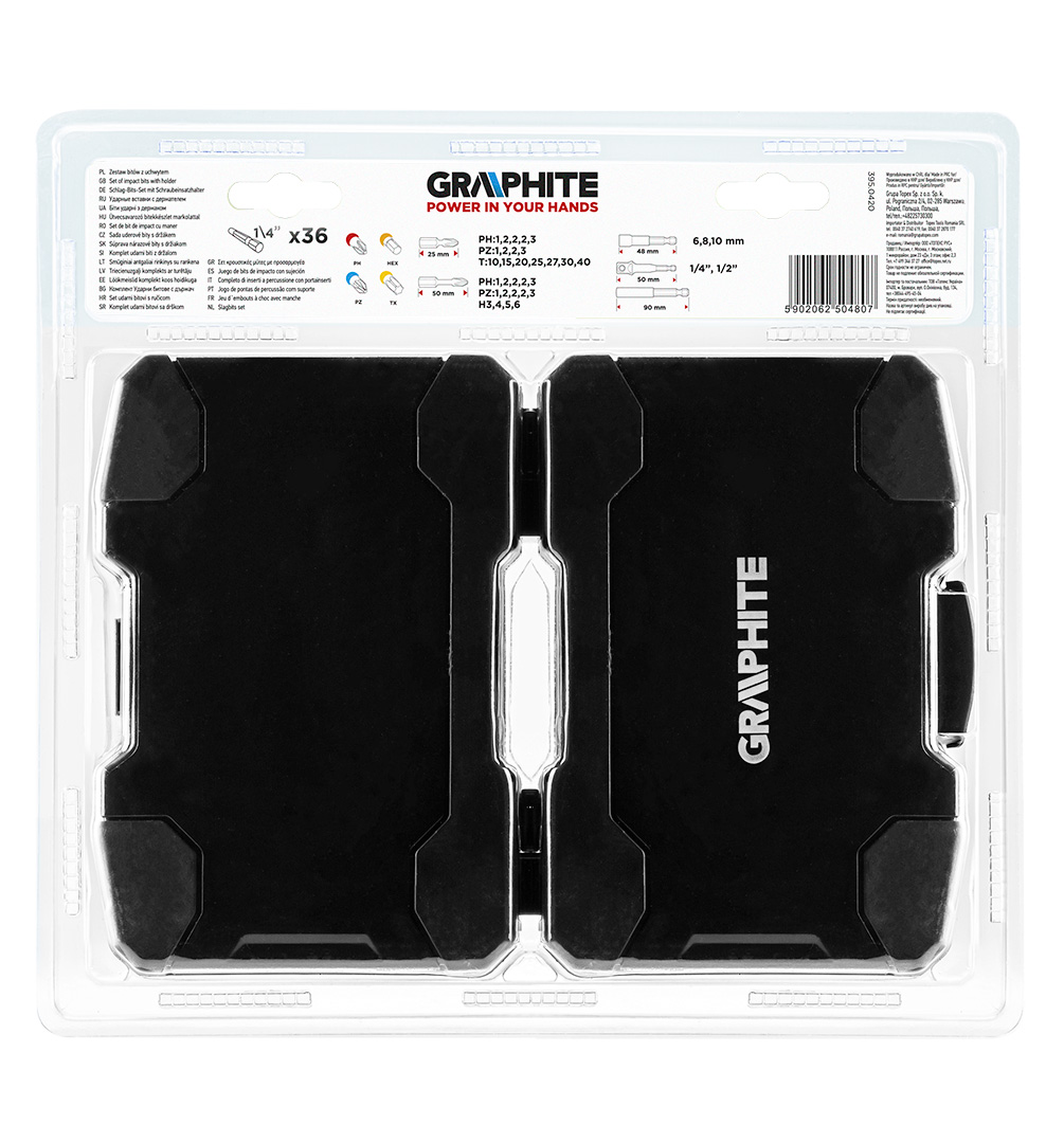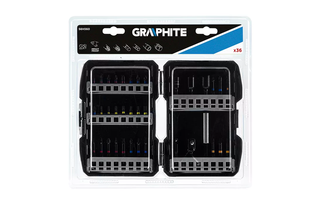 Zestaw bitów udarowych GRAPHITE (nr ref. 56H560) zawiera 36 elementów, w tym 16 końcówek typu PH1/2/2/2/3, PZ1/2/2/3, T10/15/20/25/27/30/40 o długości całkowitej 25 mm, 14 końcówek typu PH1/2/ 2/2/3, PZ1/2/2/2/3, HEX3/4/5/6 o długości całkowitej 50 mm oraz uchwyt, trzy nasadki i dwa adaptery. To wytrzymałe bity przeznaczone do cięższych prac z zastosowaniem wysokich momentów obrotowych przy użyciu wkrętarek bądź zakrętarek udarowych. Wykonane z wysokogatunkowej stali S2, która cechuje się zwiększoną elastycznością i wytrzymałością na uszkodzenia mechaniczne. Obracająca się pod wpływem wysokiego momentu obrotowego strefa skrętna zmniejsza przenoszenie siły, przez co bit jest bardziej odporny na złamanie, a jego żywotność jest wydłużona kilkukrotnie. Końcówka robocza grota gwarantuje idealne dopasowanie. Całość umieszczona w zamykanej kasecie z tworzywa sztucznego z gumowanymi krawędziami. Marka GRAPHITE oferuje szeroki asortyment elektronarzędzi spełniających wymagania profesjonalistów.