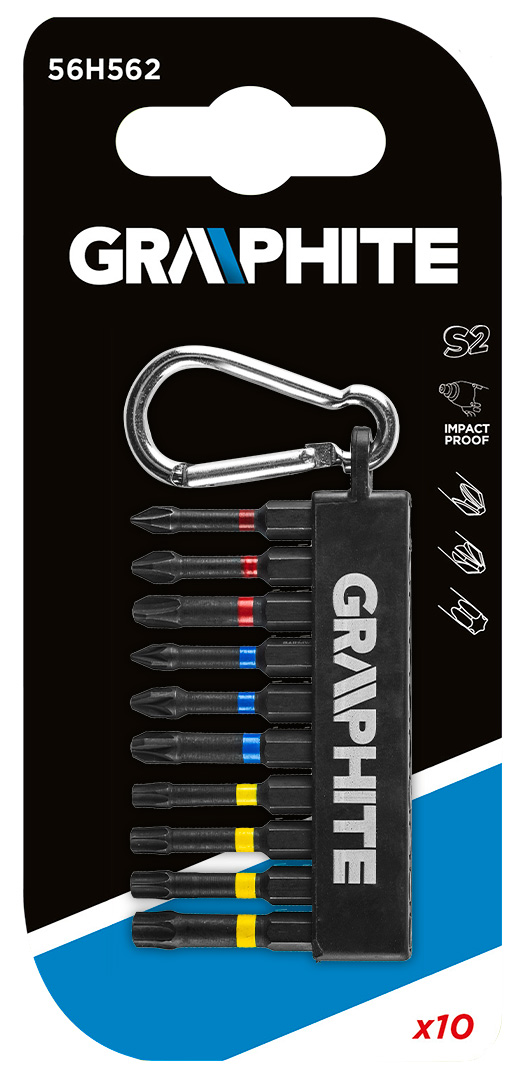Zestaw bitów udarowych GRAPHITE (nr ref. 56H562) zawiera 10 końcówek typu PH1/2/3, PZ1/2/3, TX25/27/30/40, o długości całkowitej 50 mm. To wytrzymałe bity przeznaczone do cięższych prac z zastosowaniem wysokich momentów obrotowych przy użyciu wkrętarek bądź zakrętarek udarowych. Wykonane z wysokogatunkowej stali S2, która cechuje się zwiększoną elastycznością i wytrzymałością na uszkodzenia mechaniczne. Obracająca się pod wpływem wysokiego momentu obrotowego strefa skrętna zmniejsza przenoszenie siły, przez co bit jest bardziej odporny na złamanie, a jego żywotność jest wydłużona kilkukrotnie. Końcówka robocza grota gwarantuje idealne dopasowanie. Zestaw z karabińczykiem umożliwiającym zamocowanie do szlufki paska. Marka GRAPHITE oferuje szeroki asortyment elektronarzędzi spełniających wymagania profesjonalistów.