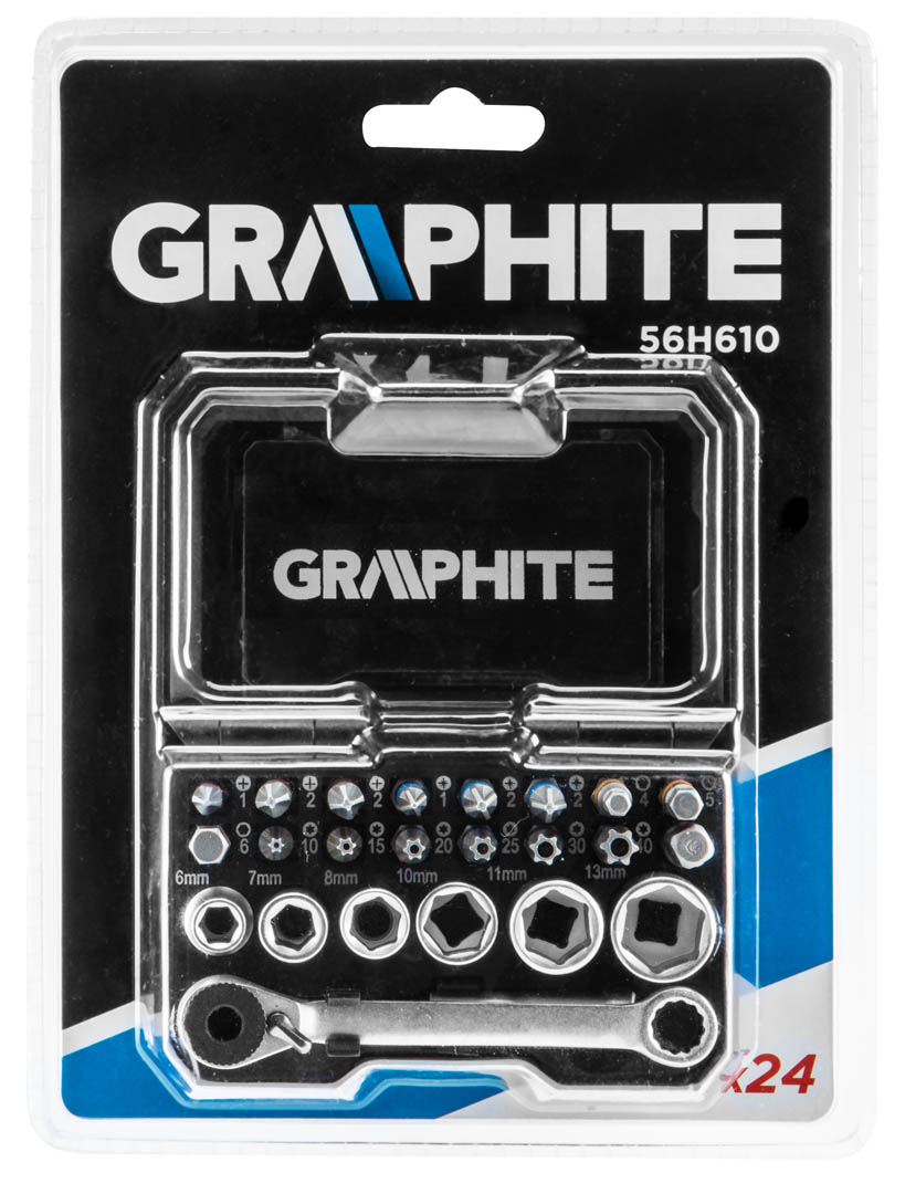 Zestaw podstawowych końcówek i nasadek GRAPHITE (nr ref. 56H610), idelny do drobnych prac montażowych. Kompaktowe opakowanie. Grzechotka pozwala na solidne i szybkie skręcanie lub rozkręcanie elementów
