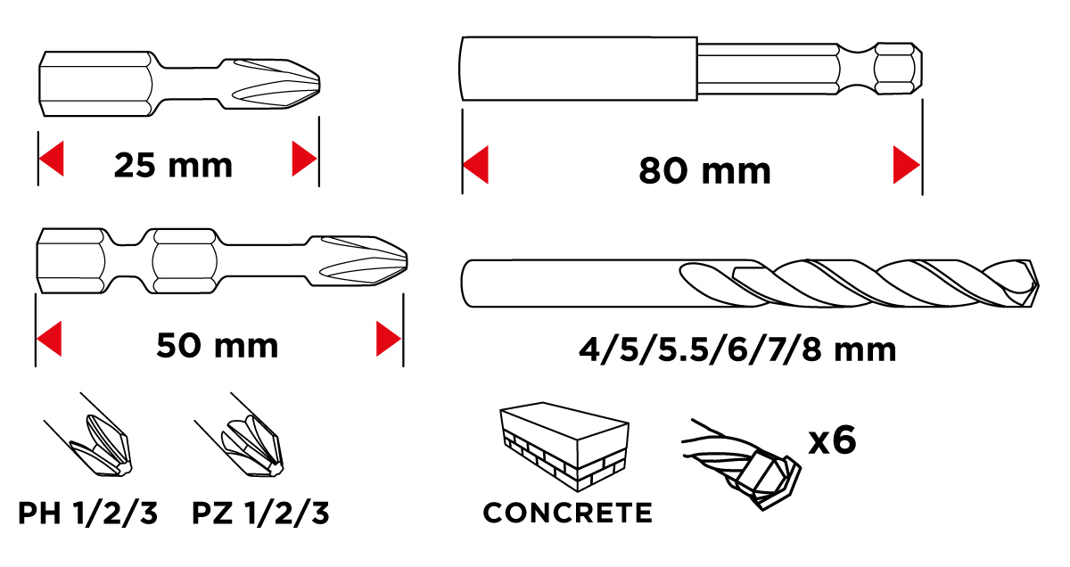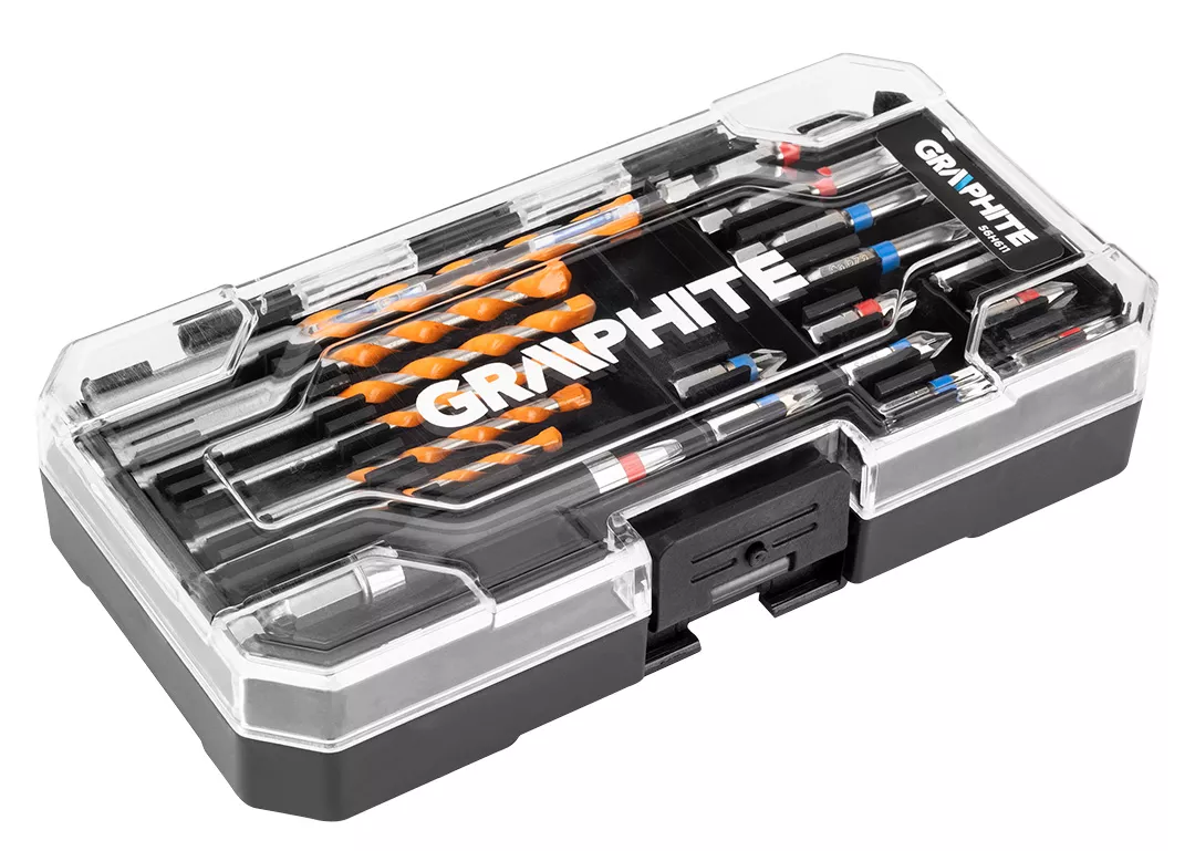 Zestaw wierteł i bitów, 20 elementów 56H611 marki GRAPHITE to wielozadaniowy zestaw narzędzi oraz akcesoriów, polecany profesjonalistom i majsterkowiczom. W jego skład wchodzą wysokiej jakości: 6 sztuk wierteł do betonu: 4-5-5.5-6-7-8 mm; 9 sztuk 25 mm: Ph1,2x Ph2, 2 x Ph3 ,PZ1, 2xPZ2, PZ3; 4 sztuki 50 mm : Ph1, Ph2, PZ1,PZ2 oraz uchwyt do bitów. Elementy zostały wykonane z solidnej stali s2, gwarantując wytrzymałość na lata ich użytkowania.