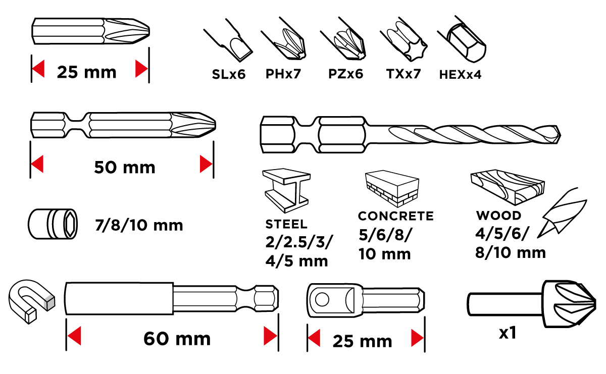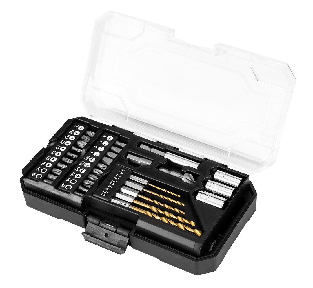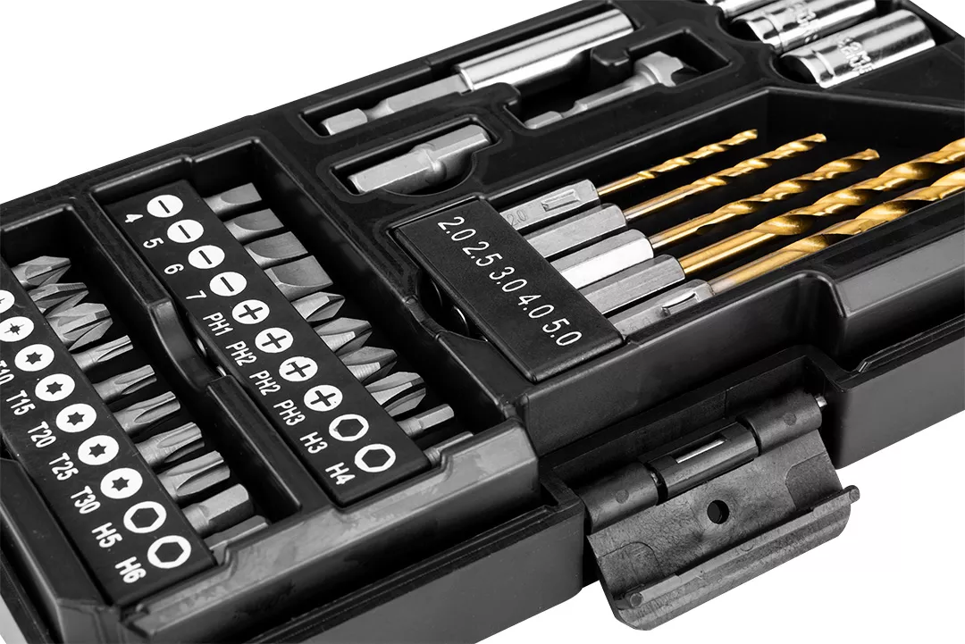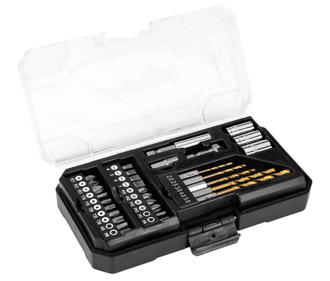 Zestaw wierteł i bitów, 50 elementów 56H613 marki GRAPHITE to wykonane z wysokiej jakości materiałów wiertła oraz bity, przeznaczone do szerokich prac profesjonalistów i majsterkowiczów. W skład tego zestawu wchodzi 5 sztuk wierteł spiralnych z powłoką tytanową i uchwytem hex: 2, 2.5, 3, 4, 5 mm; 4 sztuki wierteł do betonu z uchwytem hex: 5, 6, 8, 10 mm; 5 sztuk wierteł do drewna z uchwytem hex:4, 5, 6, 8, 10 mm; aż 20 sztuk bitów 25 mm: w tym 4 sztuki SLOTTED: 4, 5, 6, 7 mm, 4 sztuki PHILLIPS:#1, #2, #2, #3, 3 sztuki POZI: #1, #2, #3, 5 sztuk STAR: T10, T15, T20, T25, T30 i 4 sztuki HEX: 3, 4, 5, 6 mm. Na zestaw składa się również na 10 bitów 50 mm: w tym 2 sztuki SLOTTED: 4, 6 mm oraz 3 sztuki PHILLIPS: #1, #2, #3, 3 sztuki POZI: #1, #2, #3 i 2 sztuki STAR: T20, T25. W opakowaniu można znaleźć także 3 sztuki nasadek 7, 8, 10 mm; adapter 25 mm, uchwyt magnetyczny oraz wiertło do fazowania. Ten zestaw wierteł i bitów od marki GRAPHITE, składający się na 50 elementów sprawdzi się podczas wielu różnorodnych projektów.