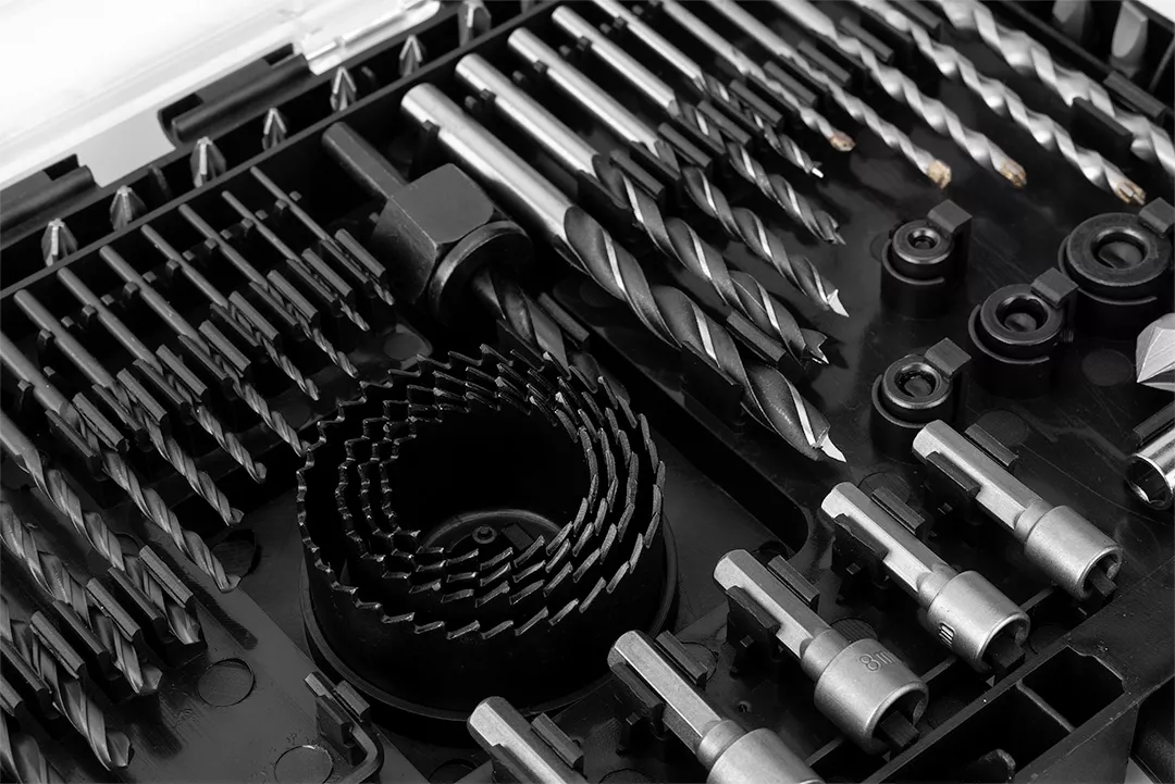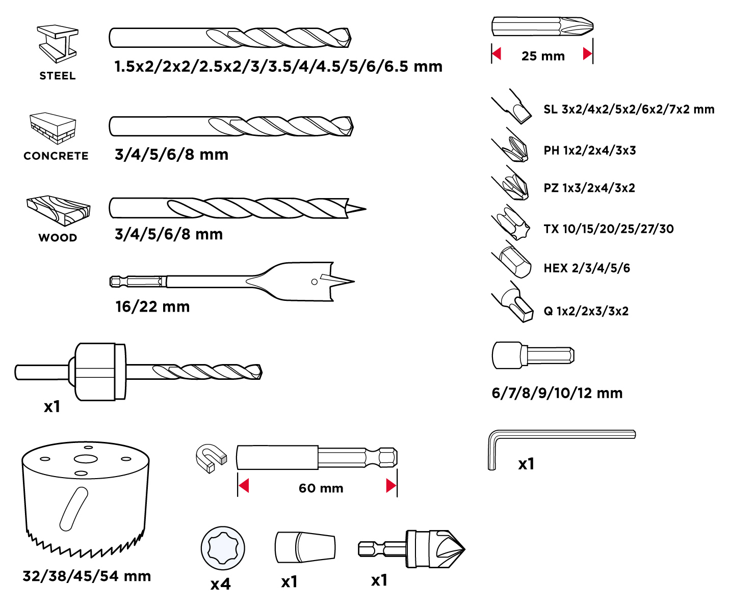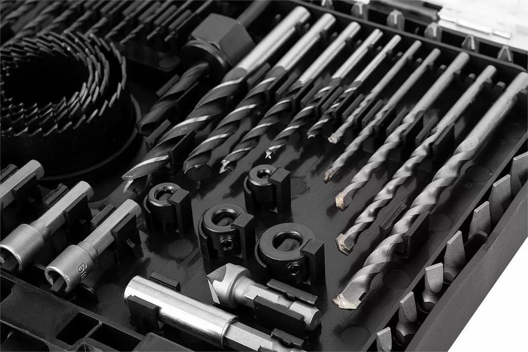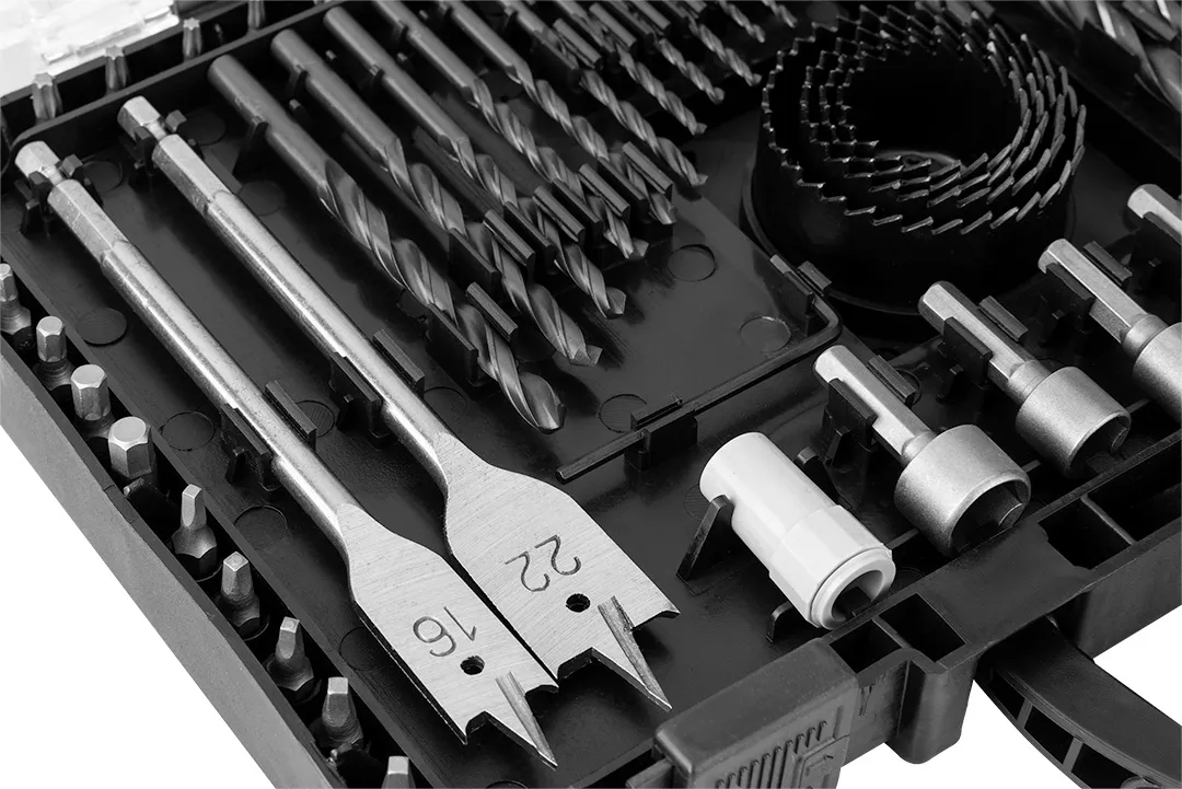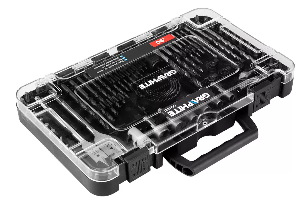 Zestaw wierteł i bitów, nasadki, 90 elementów 56H621 marki GRAPHITE to niezbędny dla profesjonalistów oraz majsterkowiczów zestaw, składający się z 90 sztuk wysokiej jakości narzędzi i akcesoriów. W skład zestawu wchodzą: 13 sztuki wiertła spiralnego: 1.5-1.5-2-2-2.5-2.5-3-3.5-4-4.5-5-6-6.5 mm; 5 sztuk wiertła do drewna: 3-4-5-6-8 mm; 5sztuk wiertła do betonu:3-4-5-6-8 mm; 2 sztuki wiertła łopatkowego:16-22 mm; 46 bitów 25 mm: PHILLIPS: #1x2, #2x4, #3x3. SLOTTED:(3-4-5-6-7mm)x2. SQUARE: #1x2, #2x3, #3x2. STAR: T10, T15, T20, T25, T27, T30. POZI:PZ1x3, PZ2x4,PZ3x2. HEX:2-3-4-5-6 mm; 4 sztuki otwornic:32-38-45-54 mm; adapter, 6 końcówek:6-7-8-9-10-12 mm; uchwyt magnetyczny; 4 ograniczniki wiercenia:3-5-6-8 mm; klucz Hex oraz wiertło do fazowania. Ten zestaw wierteł, bitów i nasadek od marki GRAPHITE będzie nieoceniony w wielu codziennych zadaniach.
