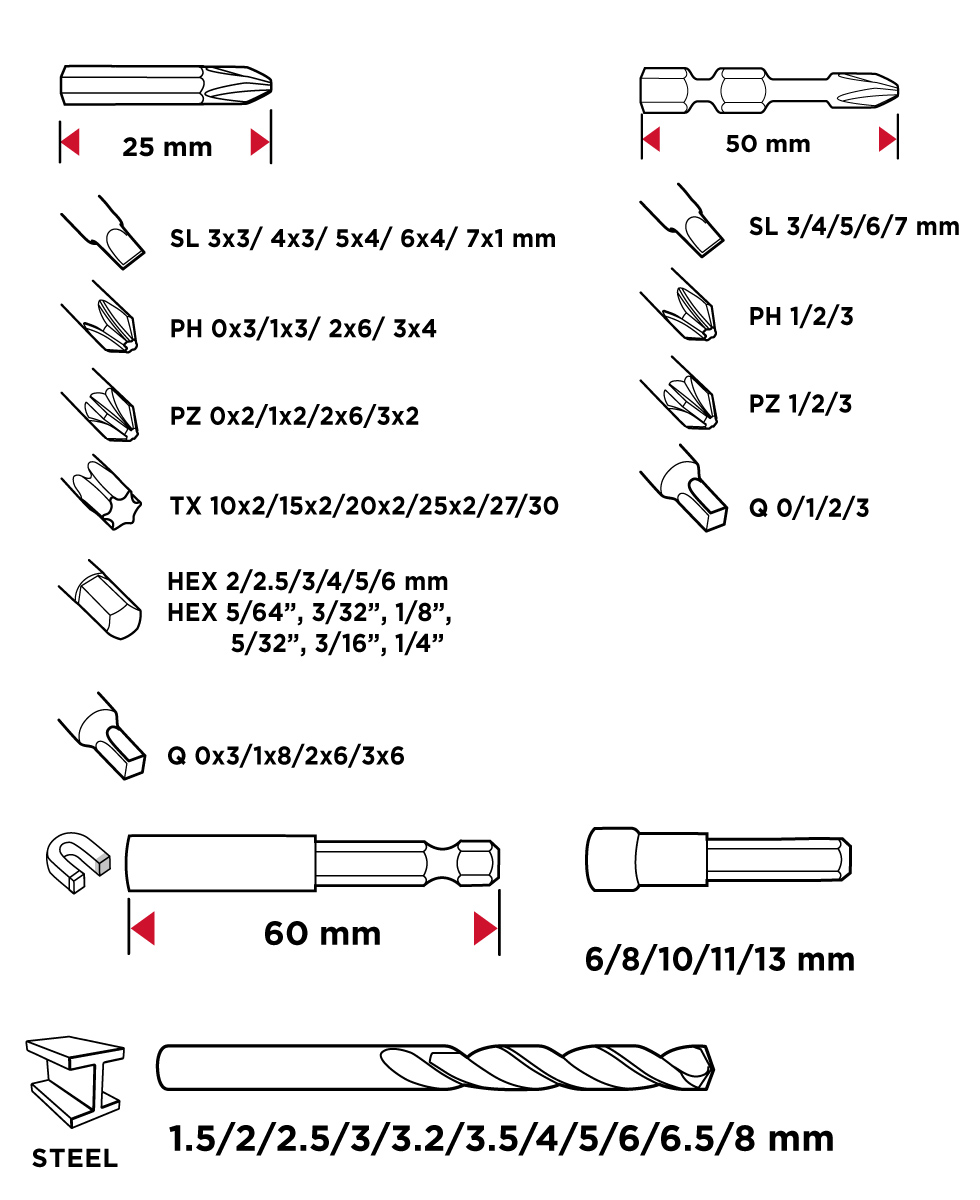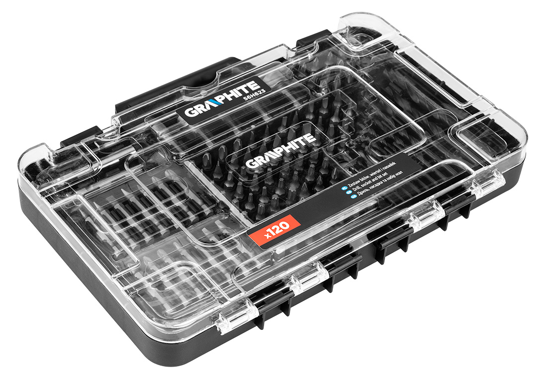 Zestaw wierteł i bitów, nasadki, 120 elementów 56H623 marki GRAPHITE to kompleksowy zestaw składający się z aż 120 elementów, polecanych do pracy zarówno majsterkowiczom jak i profesjonalistom. W wygodnej do przechowywania kasetce znalazło się: 11 wierteł spiralnych:1.5, 2, 2.5, 3, 3.2, 3.5, 4, 5, 6, 6.5, 8 mm; 88 bitów 25 mm: PHILLIPS: #0X3, #1X3, #2X6, #3X4. SLOTTED:3X3, 4X3, 5X4, 6X4, 7X1. SQUARE: #0X3, #1X8, #2X6, #3X6. STAR: T10, T10, T15, T15, T20, T20, T25, T25, T27, T30. POZI:PZ0X2, PZ1X2, PZ2X6,PZ3X2. HEX(mm): 2, 2.5, 3, 4, 5, 6 mm, HEX (cale):5/64, 3/32, 1/8, 5/32, 3/16, 1/4"; 15 bitów 50 mm: PHILLIPS: #1, #2, #3. POZI: #1, #2, #3. SQUARE: #0, #1, #2, #3 SLOTTED:3, 4, 5, 6, 7 mm; 5 końcówek magnetycznych 6, 8, 10, 11, 13 mm oraz uchwyt magnetyczny. Akcesoria i narzędzia przeznaczone są do różnorodnych projektów oraz pracy z wieloma rodzajami materiałów.