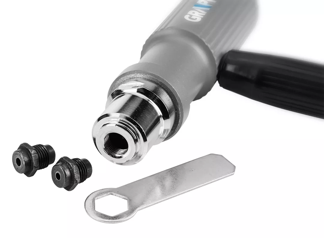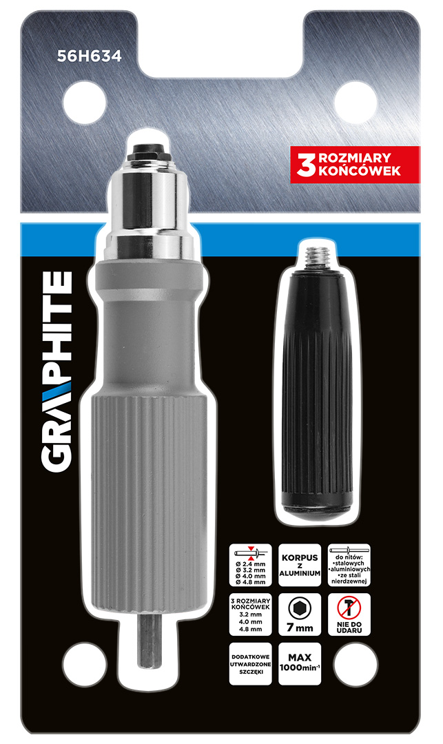 Adapter do nitów zrywlanych na wkrętarkę 56H634 marki GRAPHITE to adapter posiadający 3 rozmiary końcówek do montowania nitów stalowych i aluminiowych o średnicach: 2,4; 3,2; 4;4,8 mm. Oferowany w zestawie z kluczem dwustronnym do ich wymiany, a także – zestawem dodatkowych szczęk, które umieszczono w rękojeści. Korpus adaptera marki GRAPHITE został wykonany z lekkiego aluminium, głowica z solidnej stali, a uchwyt z tworzywa sztucznego. Adapter posiada długość 156 mm i 111 mm wysokości. Jego montaż na wkrętarkę jest niezwykle łatwy, a zrywanie nitów – bezproblemowe. Aby zacisnąć nit włącza się prawe obroty (te same, jak w przypadku wkręcania wkrętów), aby wyrzucić pozostałość trzpienia nitu, należy włączyć lewe obroty i rozkręcić produkt. W kolejnym kroku można zaciskać kolejny nit. Produkt przeznaczony dla profesjonalistów oraz amatorów.