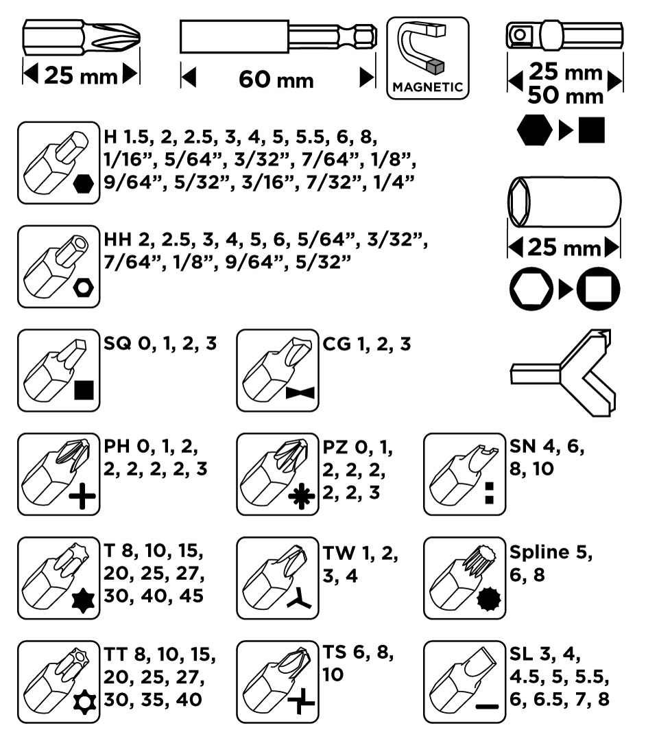 Zestaw bitów 25 mm, z uchwytem magnetycznym 60 mm, 100 szt. 56T515 marki GRAPHITE składa się ze 100 elementów: bitów H1.5/2/2.5/3/4/5/5.5/6/8/,1/16",5/64",3/32",7/64",1/8",9/64",5/32",3/16",7/32",1/4", HH2/2.5/3/4/5/6/,5/64", 3/32", 7/64", 1/8", 9/64", 5/32", SQ0/1/2/3, CG1/2/3, PH0/1/2/2/2/2/2/3, PZ0/1/2/2/2/2/2/3, SN4/6/8/10, T8/10/15/20/25/27/30/40/45, TW1/2/3/4, SP5/6/8, TT8/10/15/20/25/27/30/35/40, TS6/8/10, SL3/4/4.5/5/5.5/6/6.5/7/8 x 25 mm; uchwytu magnetycznego 60 mm, bitu do wkręcania haków oraz adapterów: adapter 1/4"Hex na 1/4 kwadrat o długości 25 mm, adapter1/4"Hex na 1/4 kwadrat o długości 50 mm, adapter 1/4"Hex na 1/4 kwadrat o długości 25 mm z wewnętrznym gniazdem. Wszystkie bity wykonane są z wytrzymałej stali chromowo-wanadowej (CrV) - zapewniając wszechstronność oraz odpowiednią trwałość podczas pracy.