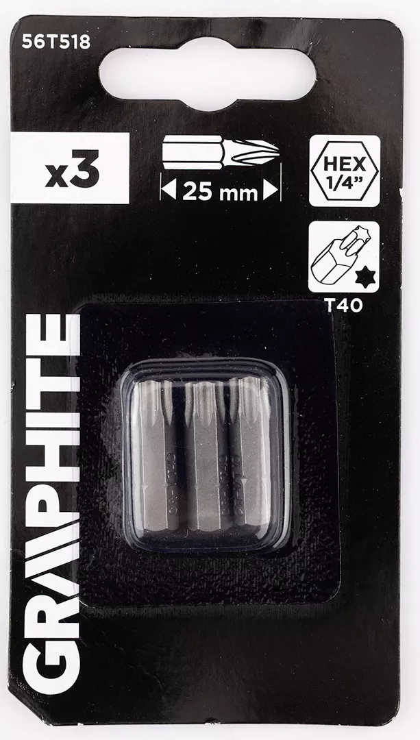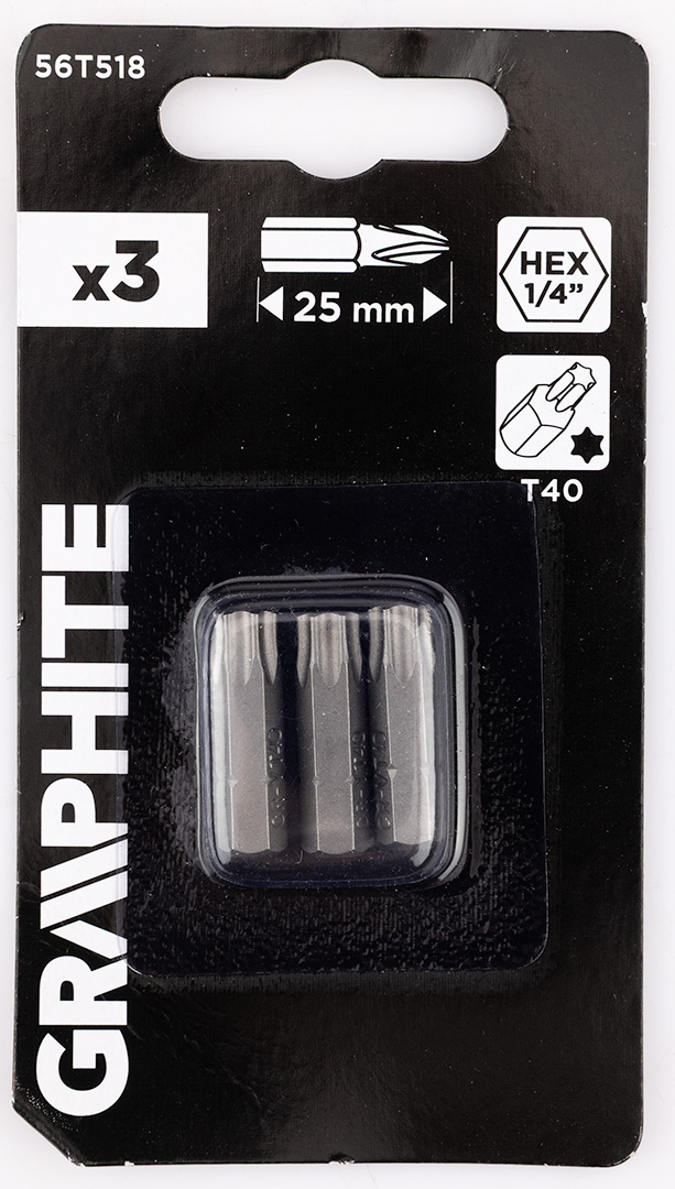 Bity Torx T40 x 25 mm, 3 sztuk 56T518 marki GRAPHITE to przydatny zestaw 3 sztuk bitów. Akcesoria wykonane są ze stali CrV, a rozmiar ich uchwytu wynosi ¼”. Przeznaczone do wiertarek i wiertarko-wkrętarek, służą do dokręcania i odkręcania śrub oraz wkrętów. Bity marki GRAPHITE sprawdzą się w wielu zadaniach.