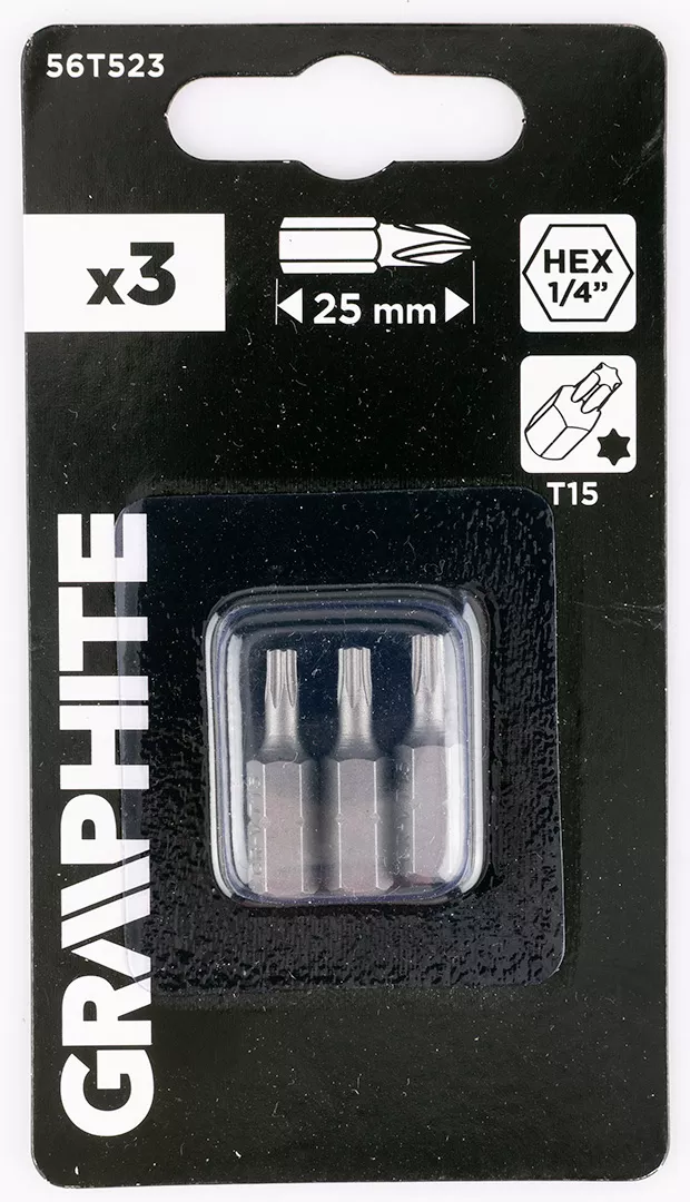 Bity Torx T15 x 25 mm, 3 sztuk 56T523 marki GRAPHITE to przydatny zestaw 3 sztuk bitów. Akcesoria wykonane są ze stali CrV, a rozmiar ich uchwytu wynosi ¼”. Przeznaczone do wiertarek i wiertarko-wkrętarek, służą do dokręcania i odkręcania śrub oraz wkrętów. Bity marki GRAPHITE sprawdzą się w wielu zadaniach.