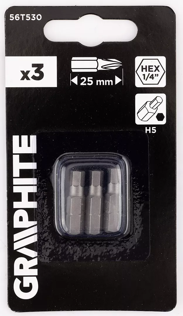 Bity Hex H5 x 25 mm, 3 sztuk 56T530 marki GRAPHITE to przydatny zestaw 3 sztuk bitów. Akcesoria wykonane są ze stali CrV, a rozmiar ich uchwytu wynosi ¼”. Przeznaczone do wiertarek i wiertarko-wkrętarek, służą do dokręcania i odkręcania śrub oraz wkrętów. Bity marki GRAPHITE sprawdzą się w wielu zadaniach.