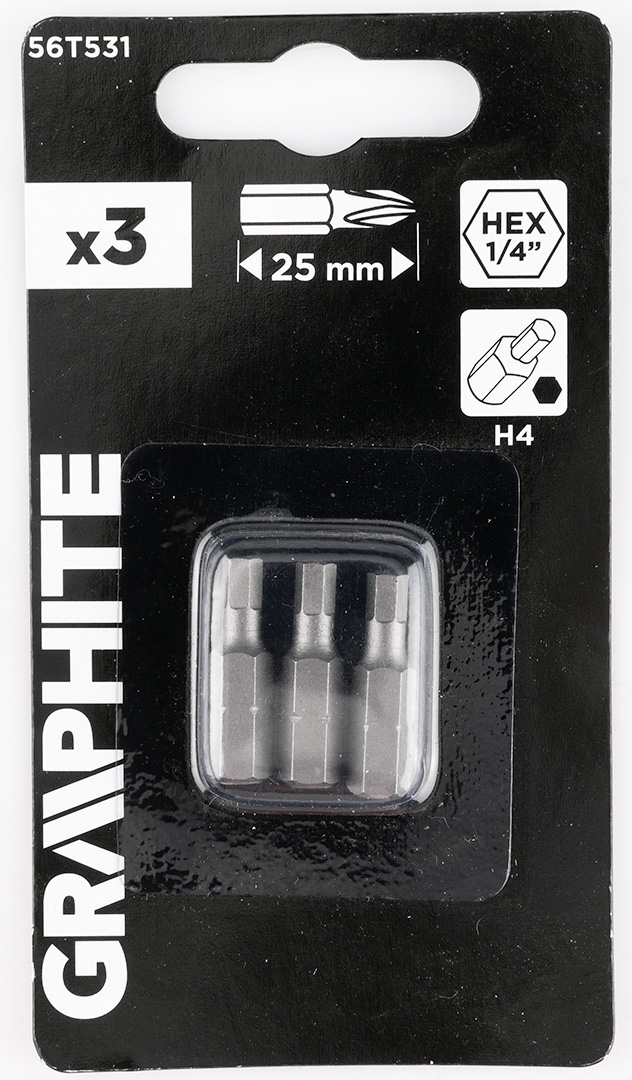 Bity Hex H4 x 25 mm, 3 sztuk 56T531 marki GRAPHITE to przydatny zestaw 3 sztuk bitów. Akcesoria wykonane są ze stali CrV, a rozmiar ich uchwytu wynosi ¼”. Przeznaczone do wiertarek i wiertarko-wkrętarek, służą do dokręcania i odkręcania śrub oraz wkrętów. Bity marki GRAPHITE sprawdzą się w wielu zadaniach.