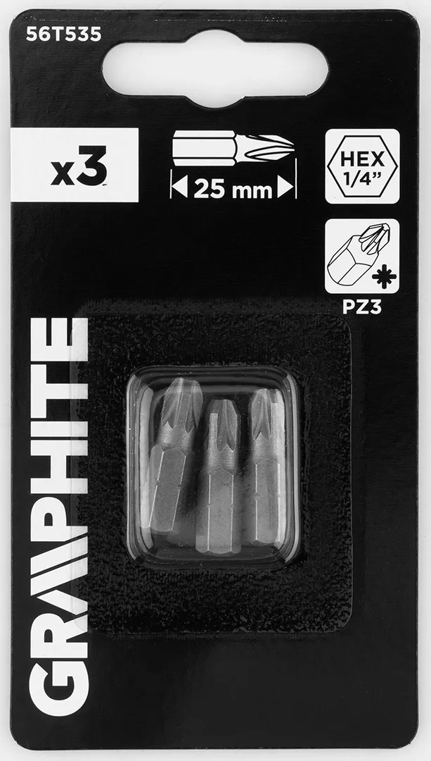 Bity PZ3 x 25 mm, 3 sztuk 56T535 marki GRAPHITE to przydatny zestaw 3 sztuk bitów. Akcesoria wykonane są ze stali CrV, a rozmiar ich uchwytu wynosi ¼”. Przeznaczone do wiertarek i wiertarko-wkrętarek, służą do dokręcania i odkręcania śrub oraz wkrętów. Bity marki GRAPHITE sprawdzą się w wielu zadaniach.