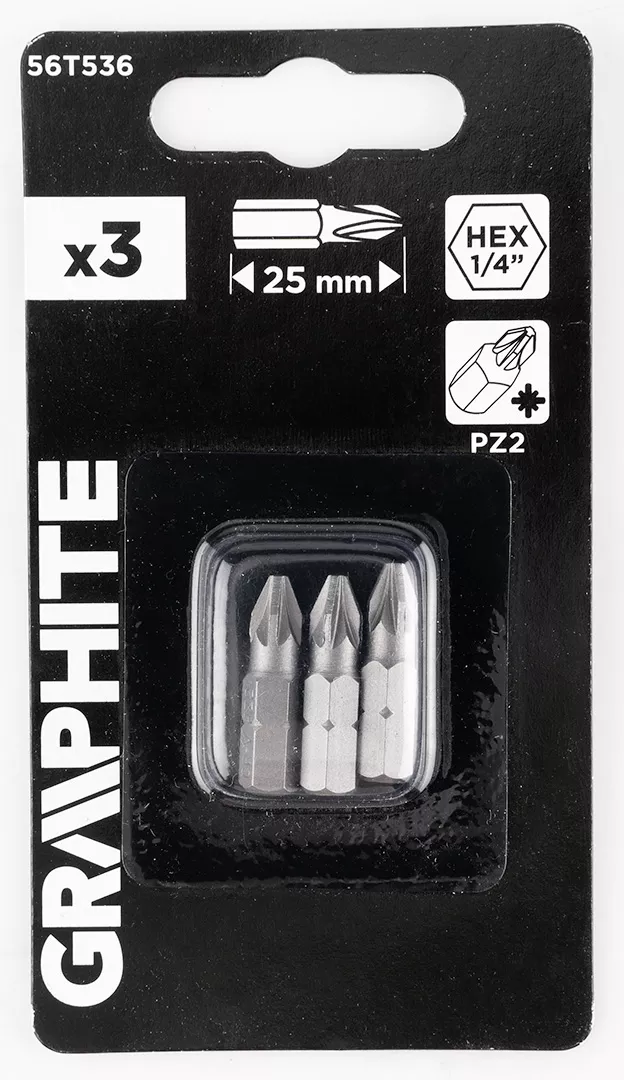 Bity PZ2 x 25 mm, 3 sztuk 56T536 marki GRAPHITE to przydatny zestaw 3 sztuk bitów. Akcesoria wykonane są ze stali CrV, a rozmiar ich uchwytu wynosi ¼”. Przeznaczone do wiertarek i wiertarko-wkrętarek, służą do dokręcania i odkręcania śrub oraz wkrętów. Bity marki GRAPHITE sprawdzą się w wielu zadaniach.