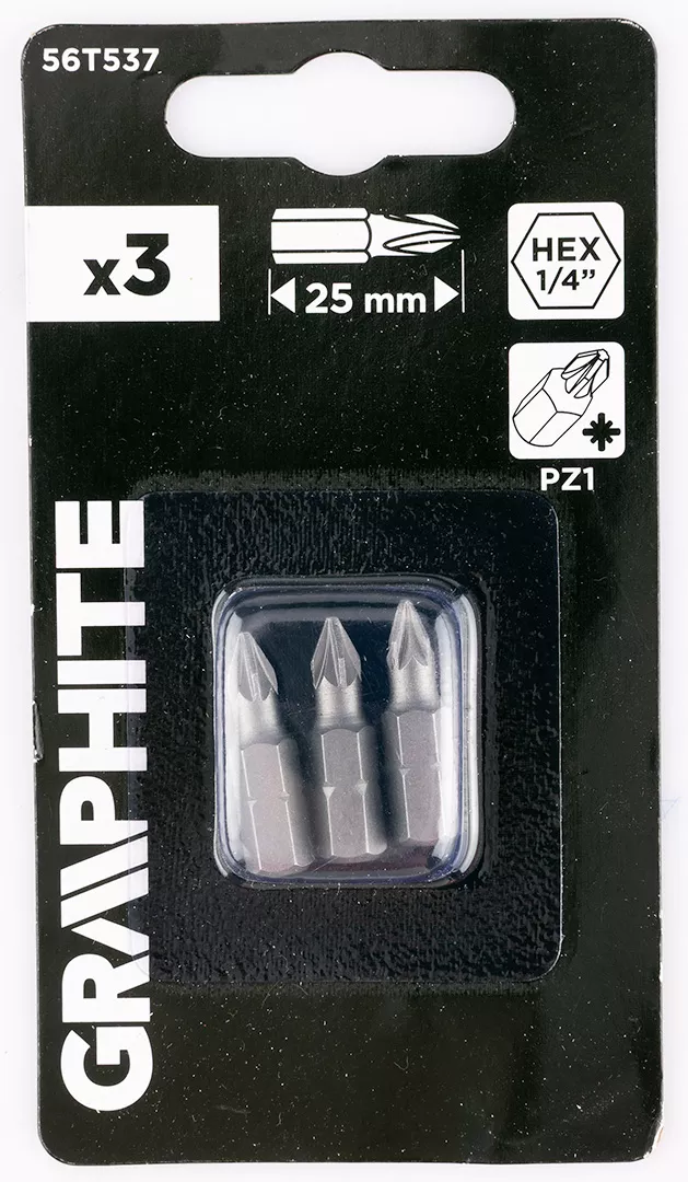 Bity PZ1 x 25 mm, 3 sztuk 56T537 marki GRAPHITE to przydatny zestaw 3 sztuk bitów. Akcesoria wykonane są ze stali CrV, a rozmiar ich uchwytu wynosi ¼”. Przeznaczone do wiertarek i wiertarko-wkrętarek, służą do dokręcania i odkręcania śrub oraz wkrętów. Bity marki GRAPHITE sprawdzą się w wielu zadaniach.