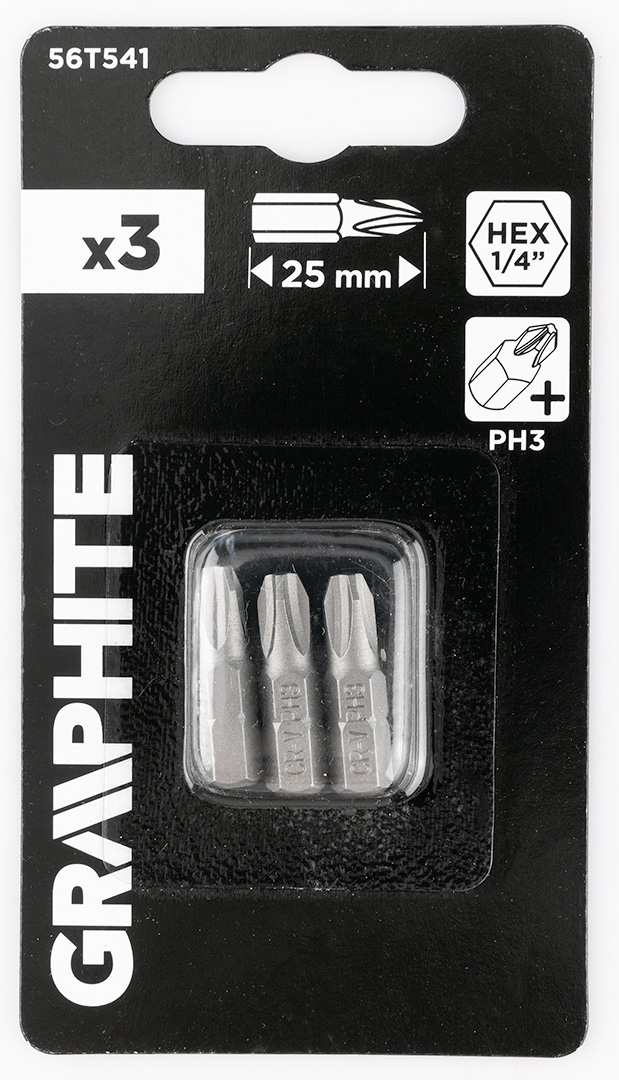Bity PH3 x 25 mm, 3 sztuk 56T541 marki GRAPHITE to przydatny zestaw 3 sztuk bitów. Akcesoria wykonane są ze stali CrV, a rozmiar ich uchwytu wynosi ¼”. Przeznaczone do wiertarek i wiertarko-wkrętarek, służą do dokręcania i odkręcania śrub oraz wkrętów. Bity marki GRAPHITE sprawdzą się w wielu zadaniach.