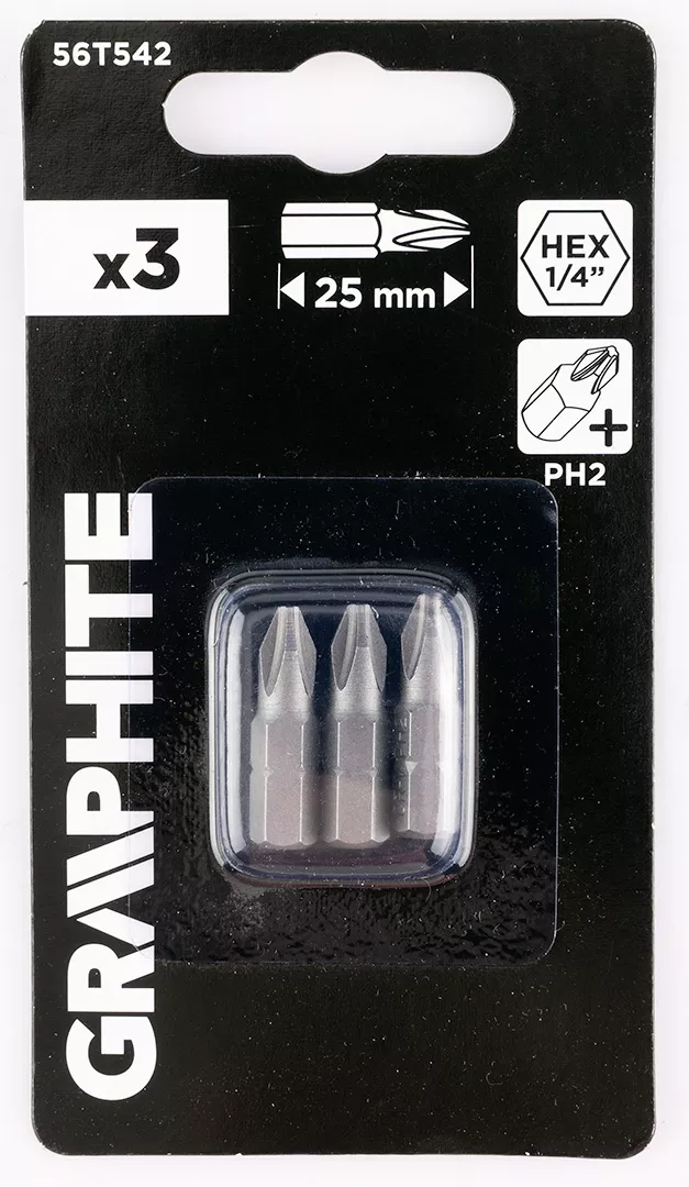 Bity PH2 x 25 mm, 3 sztuk 56T542 marki GRAPHITE to przydatny zestaw 3 sztuk bitów. Akcesoria wykonane są ze stali CrV, a rozmiar ich uchwytu wynosi ¼”. Przeznaczone do wiertarek i wiertarko-wkrętarek, służą do dokręcania i odkręcania śrub oraz wkrętów. Bity marki GRAPHITE sprawdzą się w wielu zadaniach.