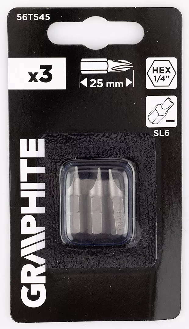 Bity SL6 x 1 x 25 mm, 3 sztuki 56T545 marki GRAPHITE to zestaw trzech końcówek przeznaczonych do prac montażowych i serwisowych. Każdy bit posiada płaskie zakończenie o szerokości 6 mm i grubości 1 mm. Długość robocza bitu wynosi 25 mm. Wykonane zostały z wytrzymałej stali CrV, zapewniając trwałość i odporność na zużycie. Standardowy uchwyt 1/4" sprawia, że bity GRAPHITE są kompatybilne z większością wiertarek oraz wiertarko-wkrętarek. Produkt przeznaczony do dokręcania i odkręcania śrub oraz wkrętów z gniazdem płaskim.