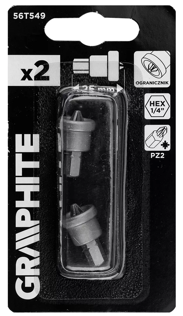 Bity z ogranicznikiem PZ2 x 25 mm, 2 sztuki 56T549 marki GRAPHITE to zestaw bitów z ogranicznikiem PZ2 o długości 25 mm, zawierający 2 sztuki wykonane z wytrzymałej stali CrV. Bity wyposażone są w uchwyt ¼”, co czyni je kompatybilnymi z większością wiertarek i wiertarko-wkrętarek. Końcówki z ogranicznikiem głębokości umożliwiają precyzyjne oraz bezpieczne wkręcanie, zwłaszcza podczas montażu płyt gipsowo-kartonowych czy paneli. Odpowiednie do efektywnego dokręcania i odkręcania wkrętów, bity z ogranicznikiem GRAPHITE sprawdzą się w wielu zadaniach.