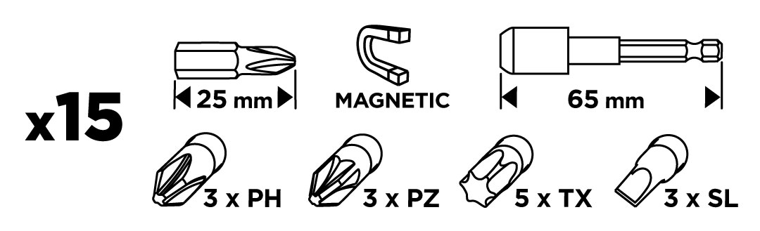 Zestaw bitów SL3/4/5, PH1/2/3, PZ1/2/3, TX10/15/20/25/30 x 25 mm, z uchwyt. magnet. 65 mm, 15 szt.