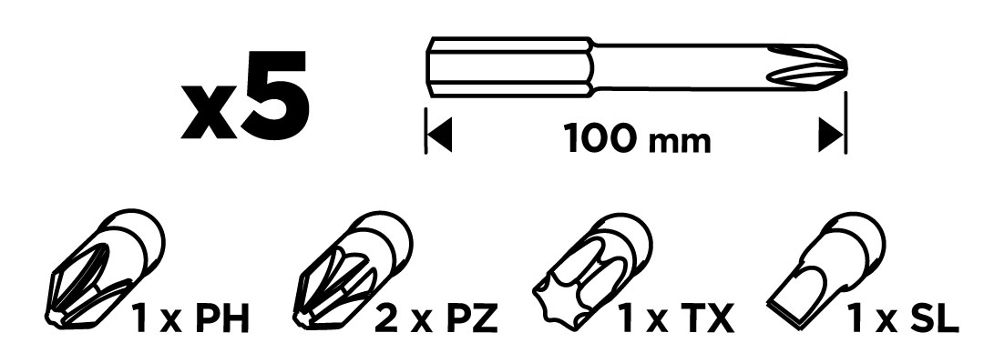 Zestaw bitów SL4, PH2, PZ1/2, TX20 x 100 mm, 5 szt.