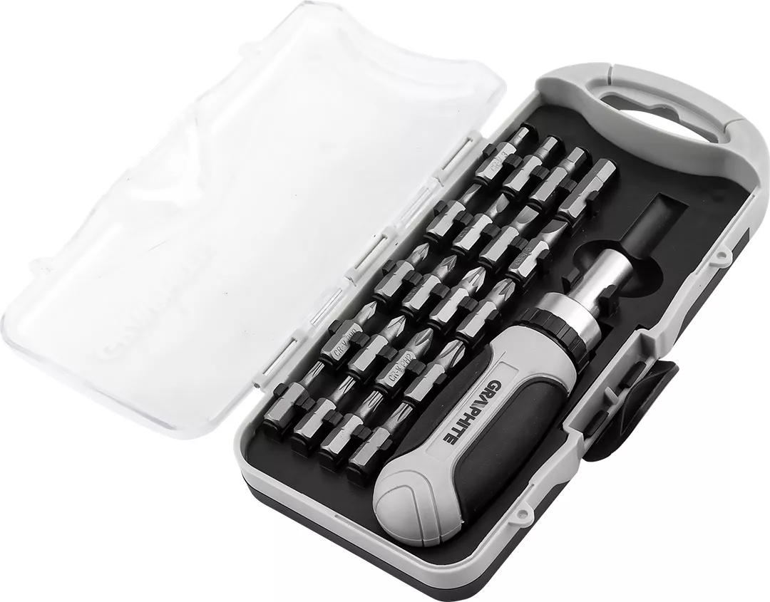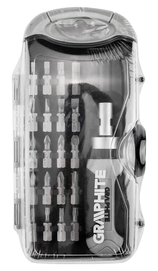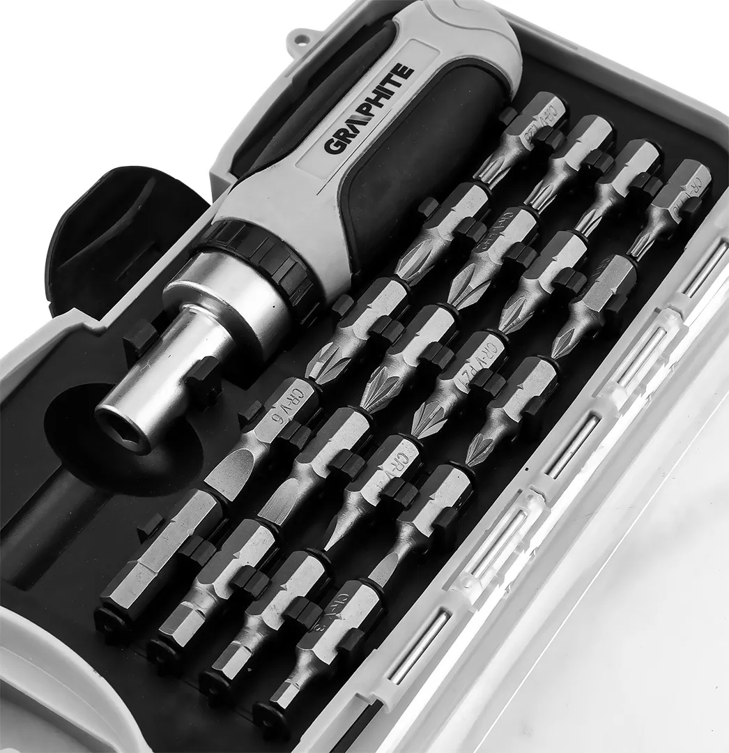 Zestaw bitów z uchwytem magnetycznym z grzechotką 115 mm, 21 szt. 56T560 marki GRAPHITE składa się z 21 elementów, w tym bitów o długości 25 mm: SL3, SL4, SL5, SL6; PH0, PH1, PH2, PH3; PZ0, PZ1, PZ2, PZ3; H3, H4, H5, H6 oraz T10, T15, T20, T25. W zestawie znajduje się także uchwyt magnetyczny z grzechotką o długości 115 mm. Uchwyt wyposażony jest dodatkowo w ergonomiczną rączkę dwukomponentową, zapewniającą wygodę oraz pewny chwyt podczas pracy. Zestaw bitów z uchwytem magnetycznym i grzechotką od marki GRAPHITE to uniwersalne rozwiązanie na wiele wyzwań dla majsterkowiczów.