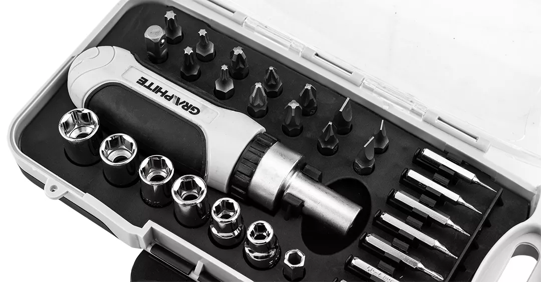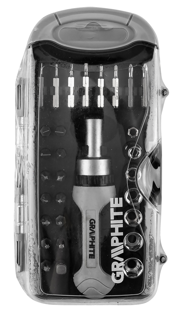 Zestaw bitów i bitów precyzyjnych z uchwytem magnetycznym z grzechotką 115 mm, 30 szt. 56T561 marki GRAPHITE to zestaw bitów oraz bitów precyzyjnych z uchwytem magnetycznym z grzechotką o długości 115 mm, zawierający 30 elementów. W skład zestawu wchodzą: bity SL4/5/6, PH1/2/3, PZ1/2/3, TX10/15/20/25 o długości 25 mm, bity precyzyjne SL1/1.5/2/2.5, PH000/00/0/1 o długości 28 mm, nasadki H5/6/7/8/9/10, adapter 1/4" Hex na 1/4" kwadrat, adapter 1/4" na 4 mm i praktyczny uchwyt magnetyczny z grzechotką. Wszystkie elementy wykonane są ze stali CrV. Uchwyt wyposażono w dwukomponentową, komfortową w użytkowaniu rękojeść.