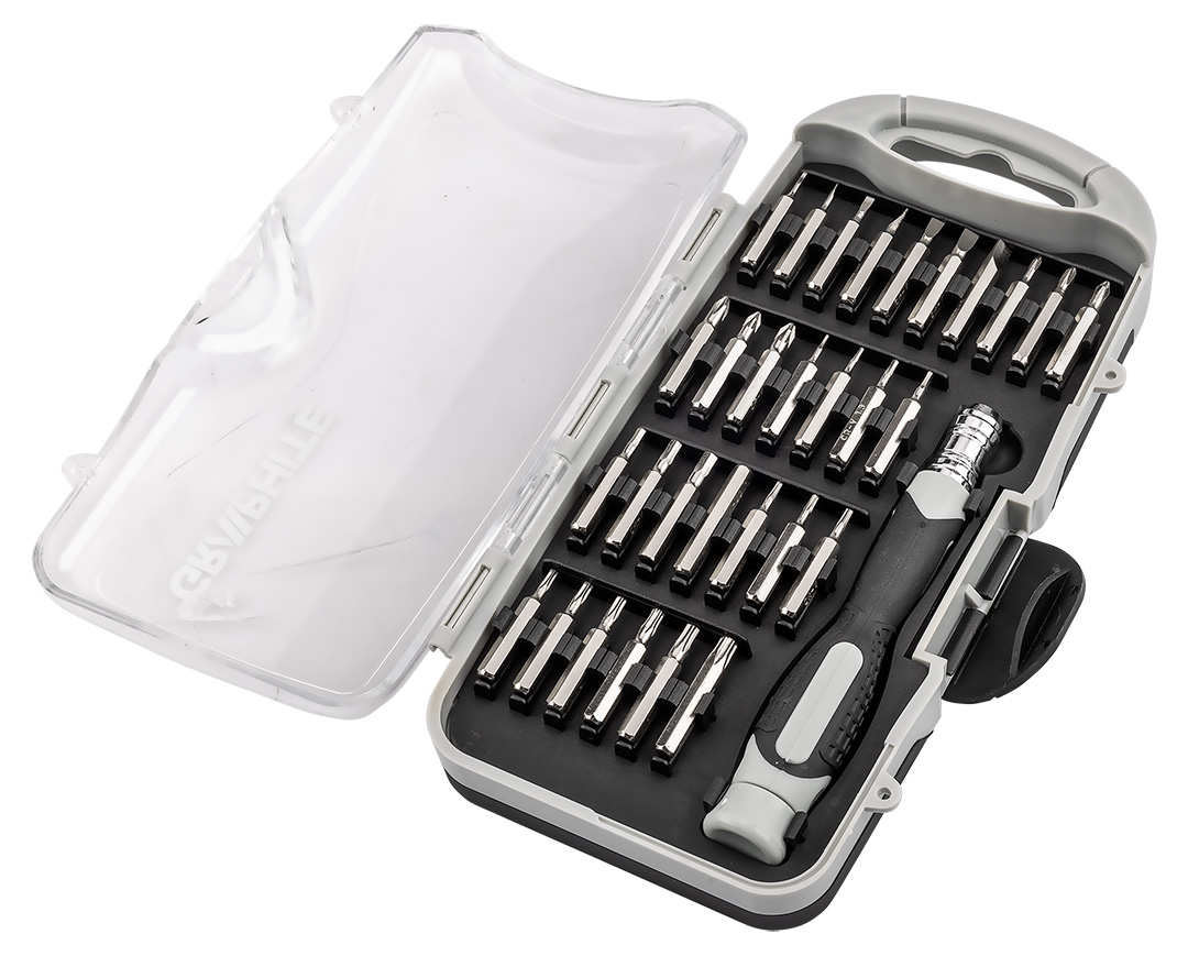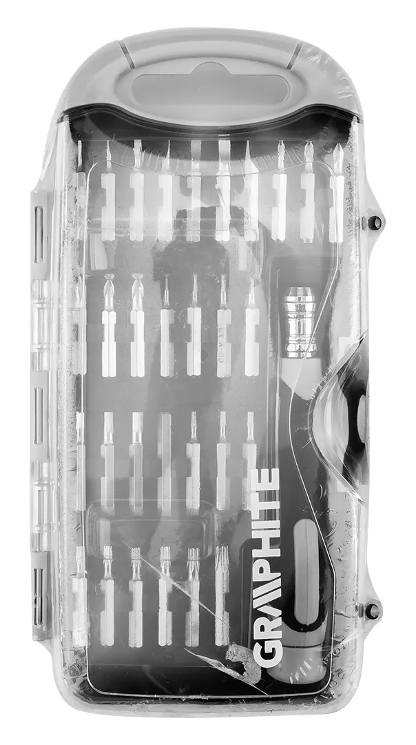 Zestaw bitów precyzyjnych 28 mm z uchwytem magnetycznym 100 mm, 31 szt. 56T562 marki GRAPHITE to zestaw bitów precyzyjnych z uchwytem magnetycznym, zawierający 31 elementów. W skład zestawu wchodzą: bity SL4/5/6, PH1/2/3, PZ1/2/3, TX10/15/20/25 o długości 25 mm, bity precyzyjne SL1/1.5/2/2.5/3/3.5/4, PH000/00/0/1, PZ0/1, H0.7/0.9/1.3/1.5/2/2.5/3/4, T4/5/6/7/8/9/10/15/20 x 28 mm i praktyczny uchwyt magnetyczny 100 mm. Wszystkie elementy wykonane są ze stali CrV. Uchwyt wyposażono w dwukomponentową, komfortową w użytkowaniu rękojeść.