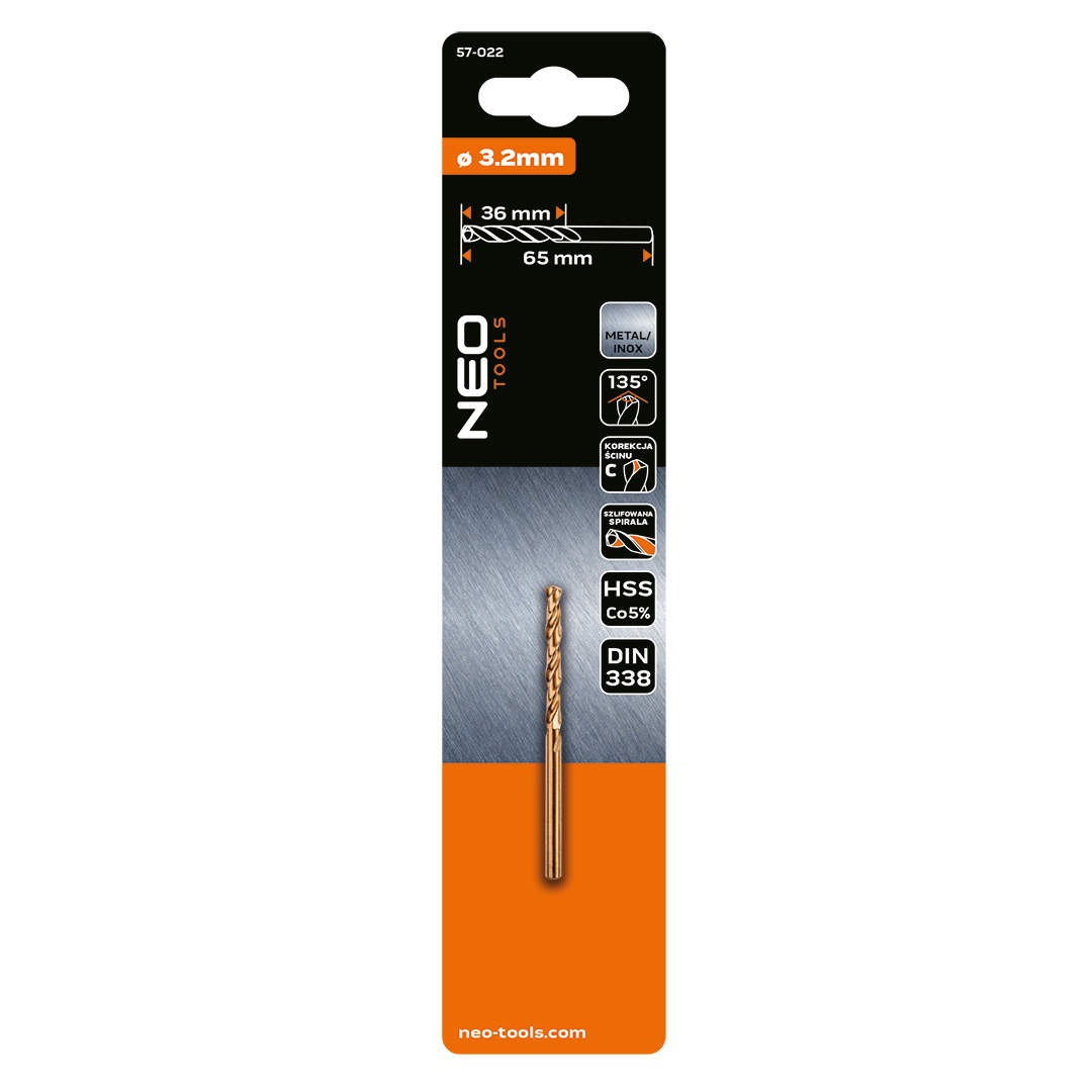 Wiertło do metalu HSS-Co 3.2 mm 57-022 marki NEO TOOLS to wiertło głęboko szlifowane zgodnie z normą DIN 338 i wykonane ze stali M35 z 5% dodatkiem kobaltu. Zastosowano w nim kąt wierzchołkowy 135° oraz korekcję ścinu typu C. Posiada uchwyt cylindryczny. Długość części roboczej wynosi 36 mm, a jego długość całkowita to 65 mm. Maksymalne prędkości obrotowe wynoszą: INOX 1150–1250 obr./min, metale ogólne 2300–2500 obr./min. Przeznaczenie tego wiertła marki NEO TOOLS to wiercenie w materiałach wymagających, takich jak stal nierdzewna, kwasoodporna i żaroodporna.