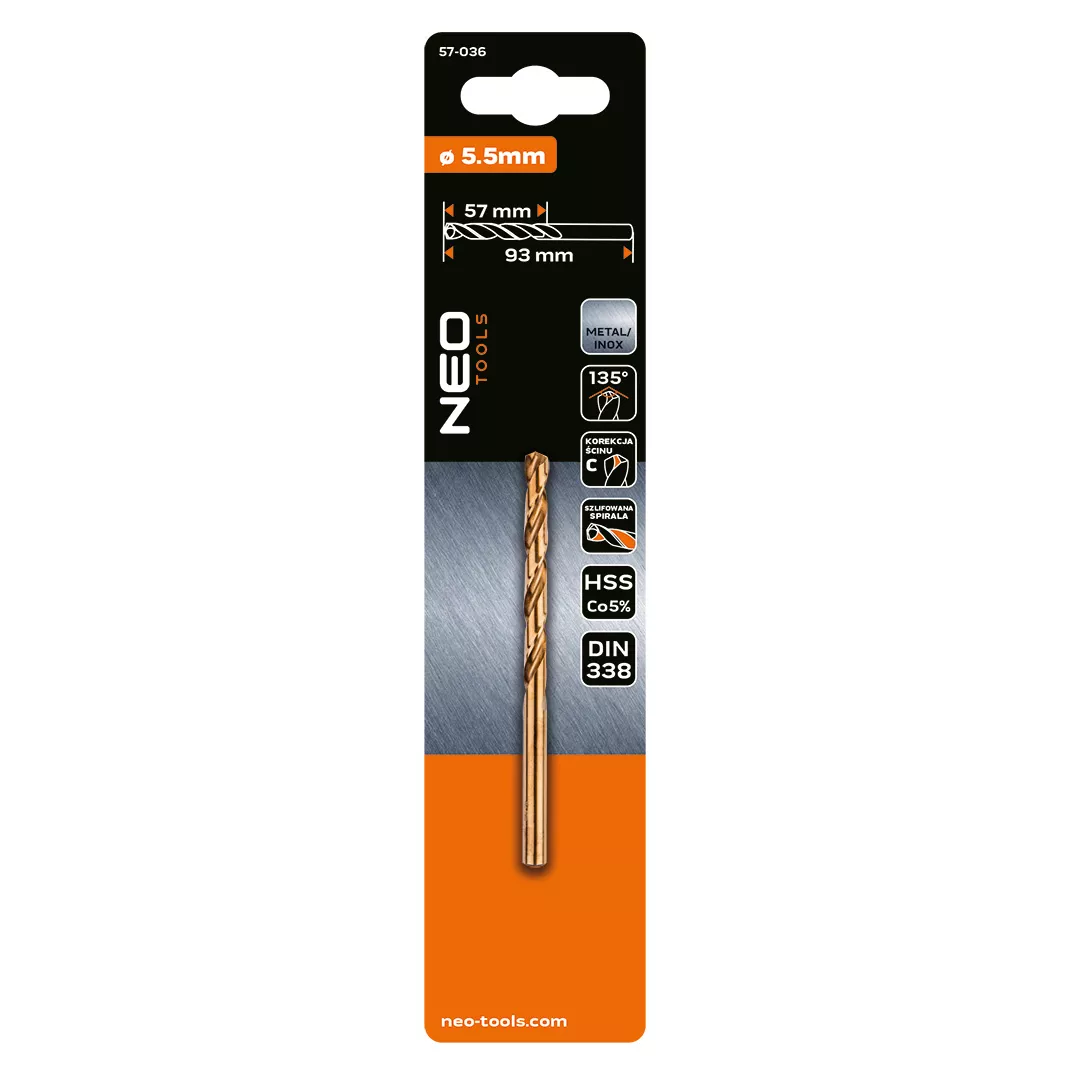 Wiertło do metalu HSS-Co 5.5 mm, 57-036 marki NEO TOOLS to wiertło głęboko szlifowane zgodnie z normą DIN 338 i wykonane ze stali M35 z 5% dodatkiem kobaltu. Zastosowano w nim kąt wierzchołkowy 135° oraz korekcję ścinu typu C. Posiada uchwyt cylindryczny. Długość części roboczej wynosi 57 mm, a jego długość całkowita to 93 mm. Maksymalne prędkości obrotowe wynoszą: INOX 675-725 obr./min, metale ogólne 1350-1450 obr./min. Przeznaczenie tego wiertła marki NEO TOOLS to wiercenie w materiałach wymagających, takich jak stal nierdzewna, kwasoodporna i żaroodporna.