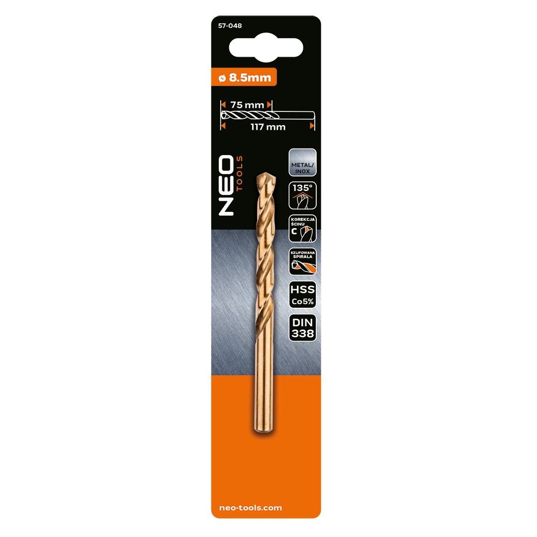Wiertło do metalu HSS-Co 8.5 mm, 57-048 marki NEO TOOLS to wiertło głęboko szlifowane zgodnie z normą DIN 338 i wykonane ze stali M35 z 5% dodatkiem kobaltu. Zastosowano w nim kąt wierzchołkowy 135° oraz korekcję ścinu typu C. Posiada uchwyt cylindryczny. Długość części roboczej wynosi 75 mm, a jego długość całkowita to 117 mm. Maksymalne prędkości obrotowe wynoszą: INOX 425-475 obr./min, metale ogólne 850-950 obr./min. Przeznaczenie tego wiertła marki NEO TOOLS to wiercenie w materiałach wymagających, takich jak stal nierdzewna, kwasoodporna i żaroodporna.