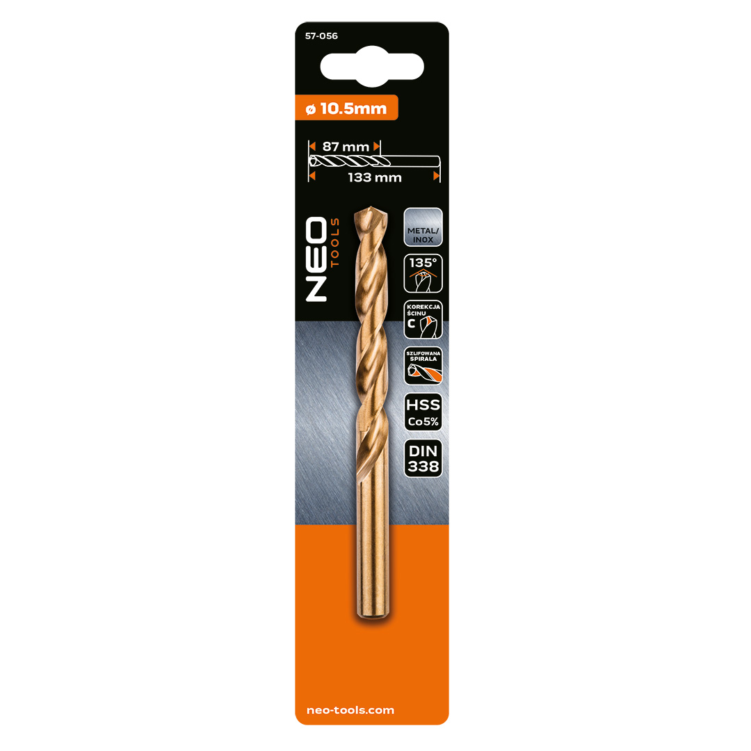 Wiertło do metalu HSS-Co 10.5 mm, 57-056 marki NEO TOOLS to wiertło głęboko szlifowane zgodnie z normą DIN 338 i wykonane ze stali M35 z 5% dodatkiem kobaltu. Zastosowano w nim kąt wierzchołkowy 135° oraz korekcję ścinu typu C. Posiada uchwyt cylindryczny. Długość części roboczej wynosi 87 mm, a jego długość całkowita to 133 mm. Maksymalne prędkości obrotowe wynoszą: INOX 350-375 obr./min, metale ogólne 700-750 obr./min. Przeznaczenie tego wiertła marki NEO TOOLS to wiercenie w materiałach wymagających, takich jak stal nierdzewna, kwasoodporna i żaroodporna.
