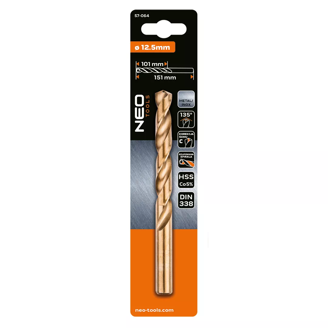 Wiertło do metalu HSS-Co 12.5 mm, 57-064 marki NEO TOOLS to wiertło głęboko szlifowane zgodnie z normą DIN 338 i wykonane ze stali M35 z 5% dodatkiem kobaltu. Zastosowano w nim kąt wierzchołkowy 135° oraz korekcję ścinu typu C. Posiada uchwyt cylindryczny. Długość części roboczej wynosi 101 mm, a jego długość całkowita to 151 mm. Maksymalne prędkości obrotowe wynoszą: INOX 300-325 obr./min, metale ogólne 600-650 obr./min. Przeznaczenie tego wiertła marki NEO TOOLS to wiercenie w materiałach wymagających, takich jak stal nierdzewna, kwasoodporna i żaroodporna.